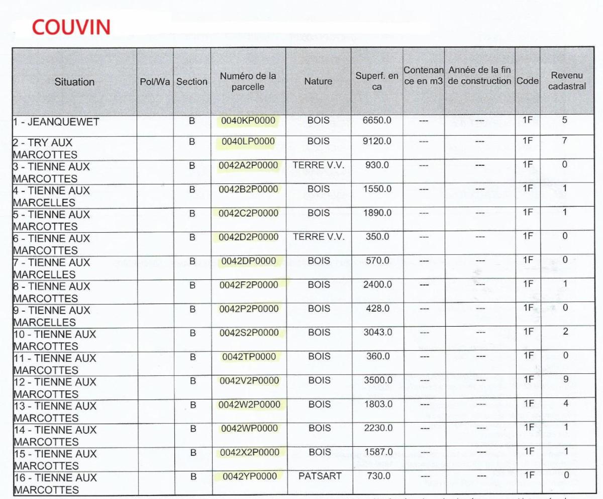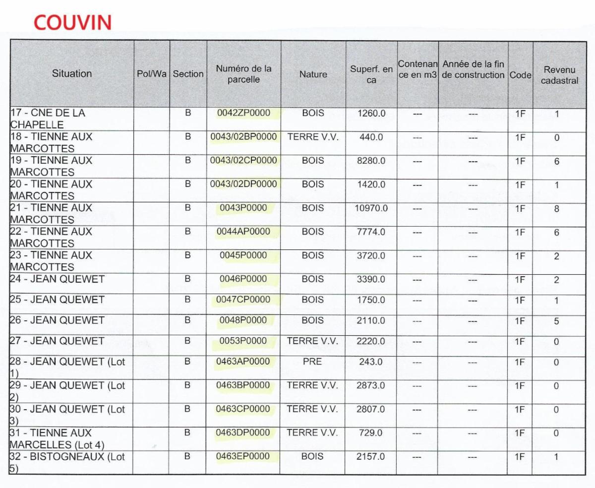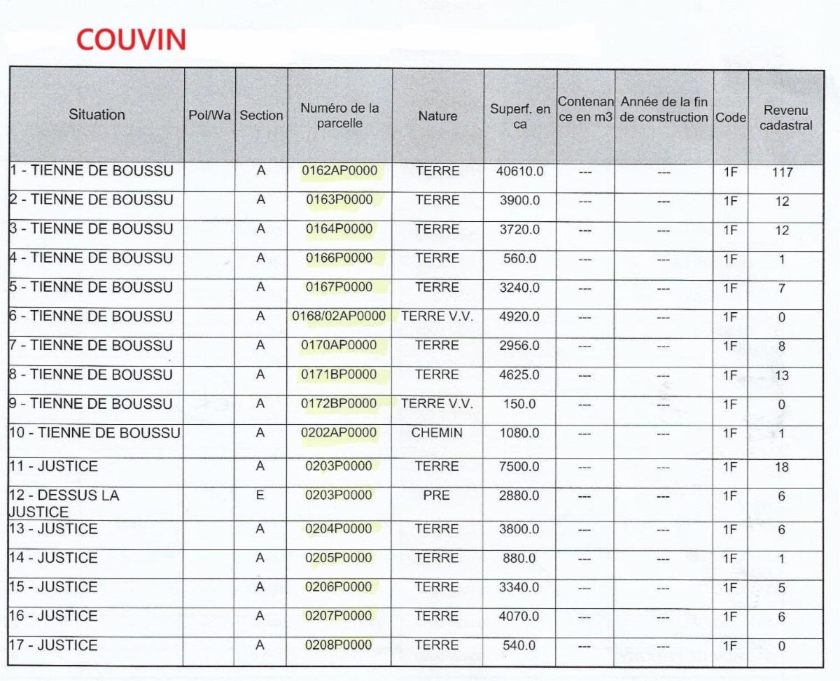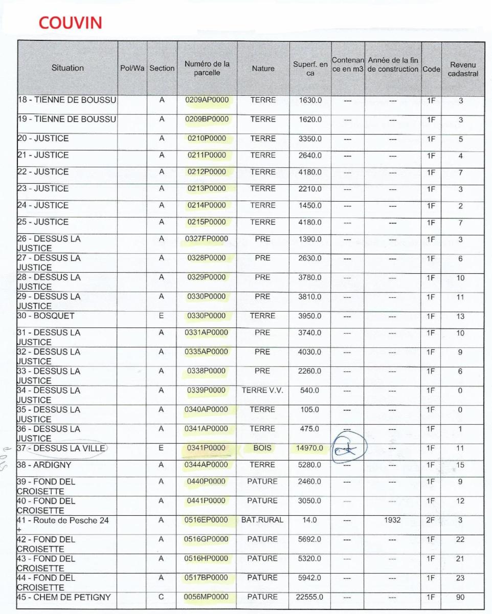 Propriétés terriennes d’une contenance approximative totale de 50ha sur les communes de Couvin, Pesche et Boussu-en-Fagne : terres, patsarts, prés, pâtures, terres v.v., bois, bâtiments ruraux. Les parcelles agricoles sont pour la plupart occupées.