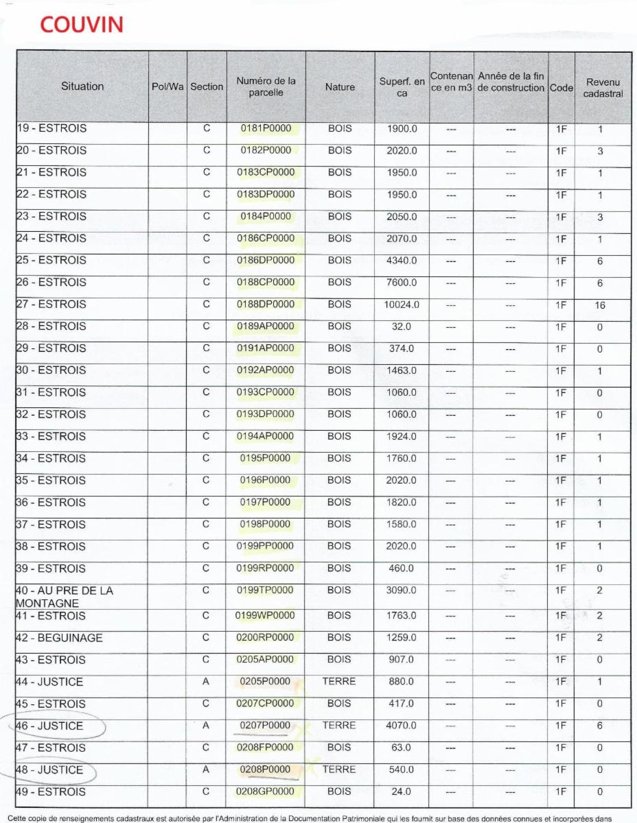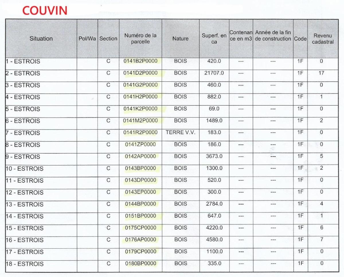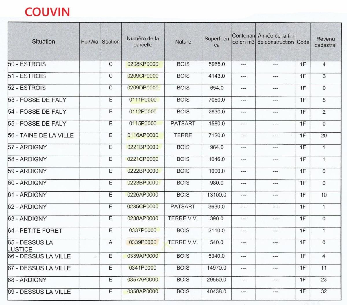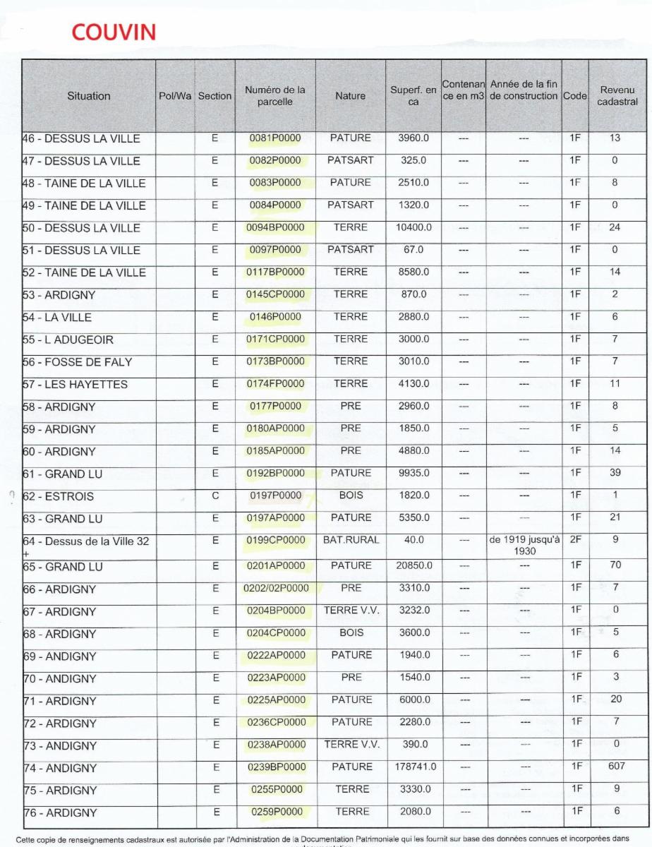 Propriétés terriennes d’une contenance approximative totale de 50ha sur les communes de Couvin, Pesche et Boussu-en-Fagne : terres, patsarts, prés, pâtures, terres v.v., bois, bâtiments ruraux. Les parcelles agricoles sont pour la plupart occupées.