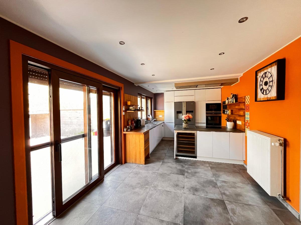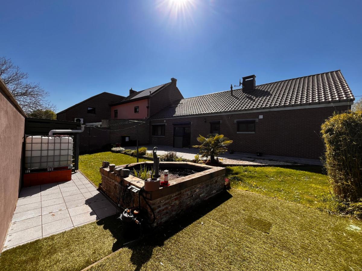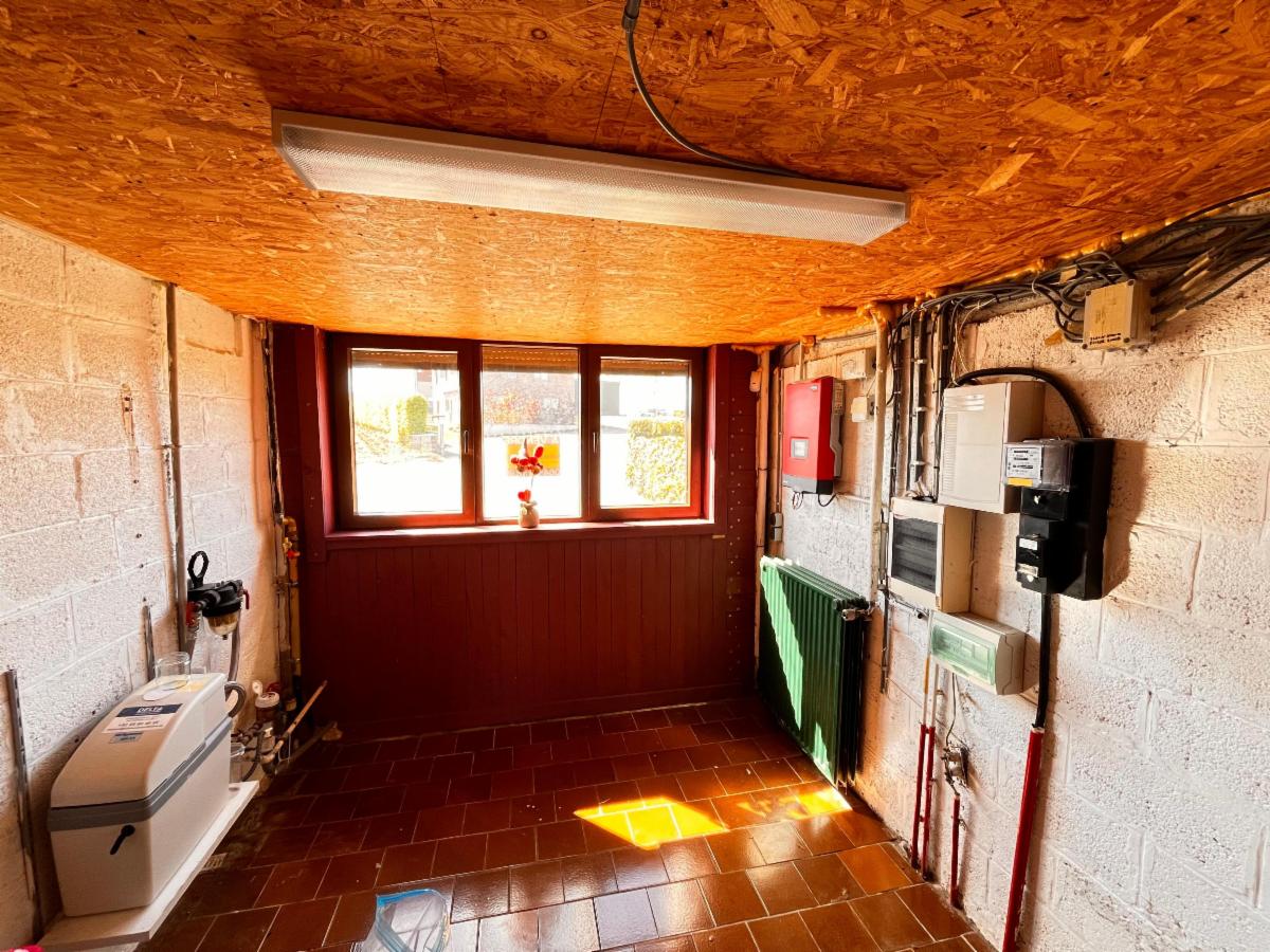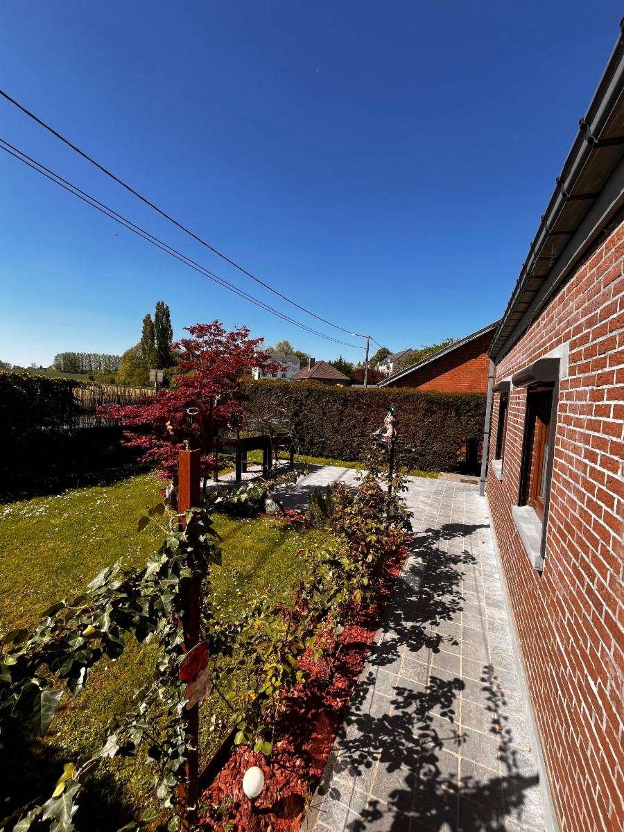 Rez : hall, 1 chambre, living en L, grande cuisine équipée avec coin à manger, cave à vin, buanderie, salle de bains (baignoire, douche, évier, WC), bureau, terrasse en pierre bleue belge, jardin avec étang, abri de jardin, atelier.