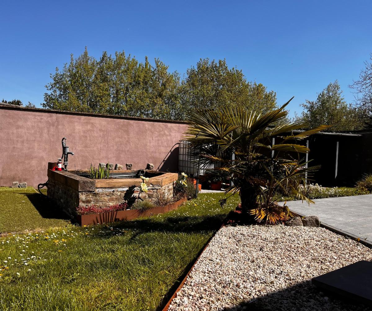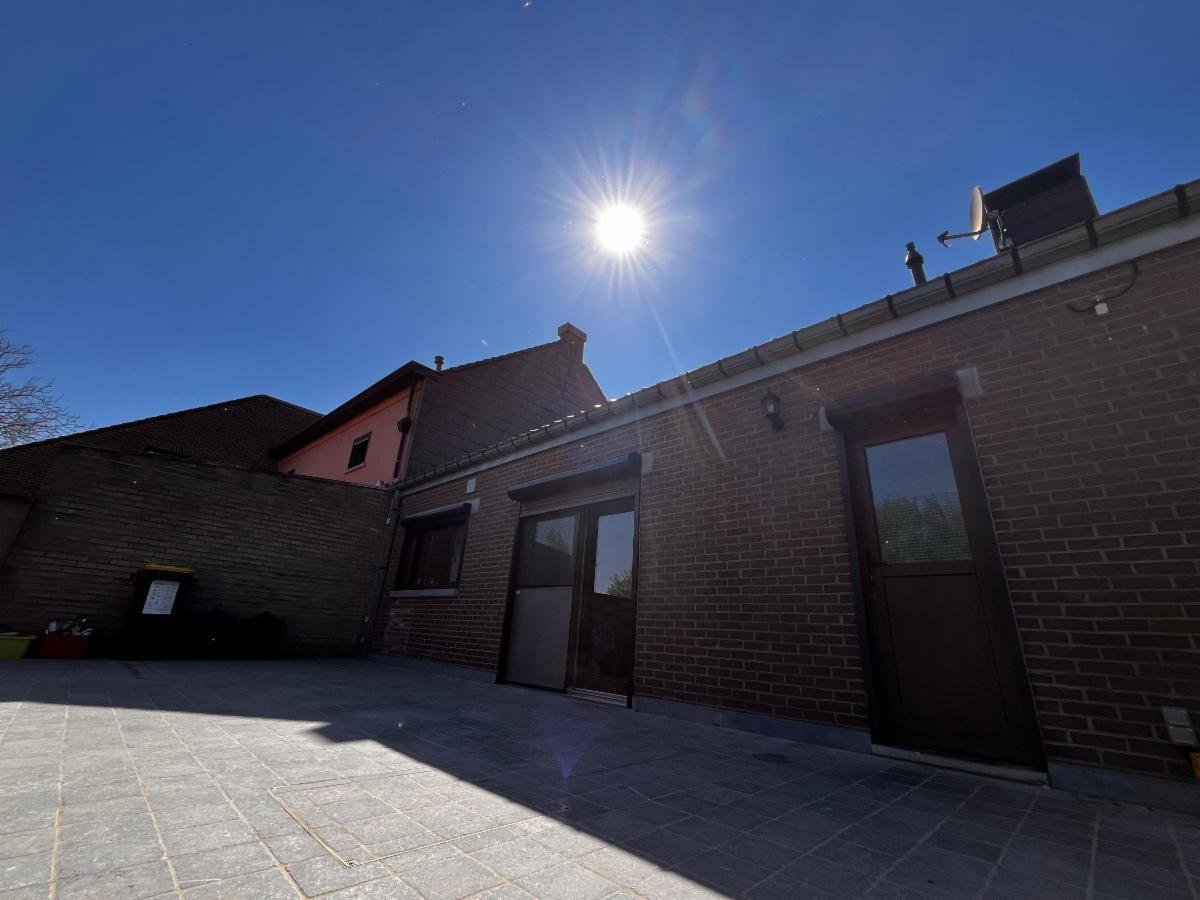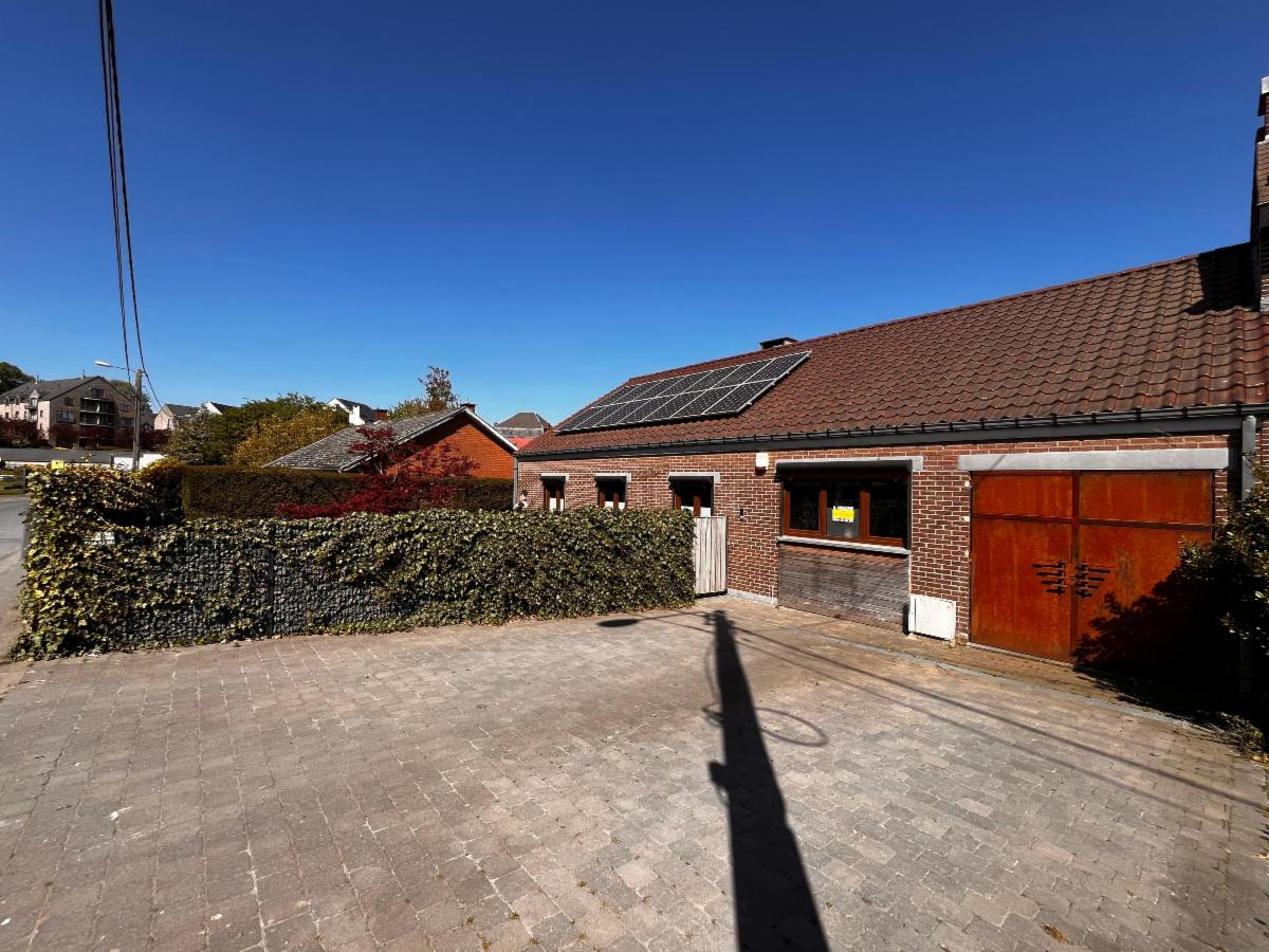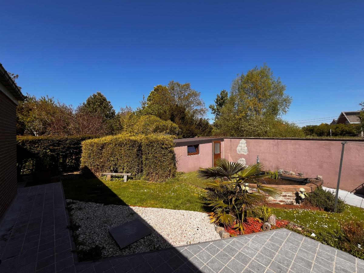 Rez : hall, 1 chambre, living en L, grande cuisine équipée avec coin à manger, cave à vin, buanderie, salle de bains (baignoire, douche, évier, WC), bureau, terrasse en pierre bleue belge, jardin avec étang, abri de jardin, atelier.