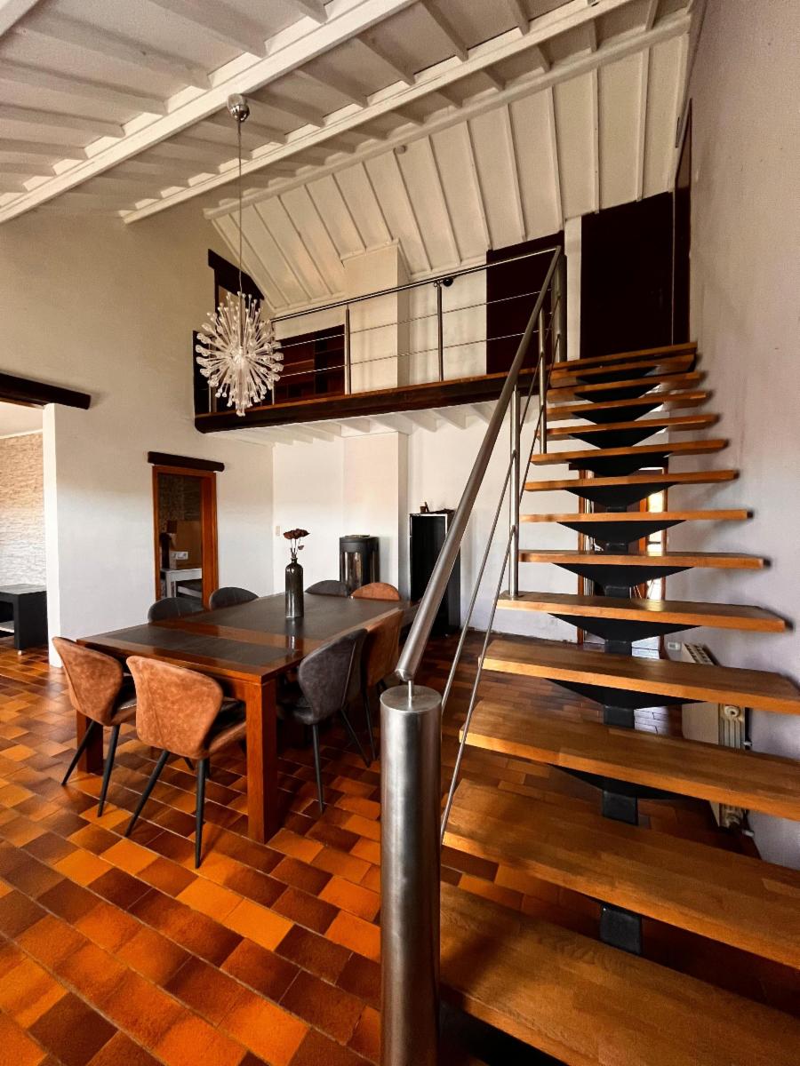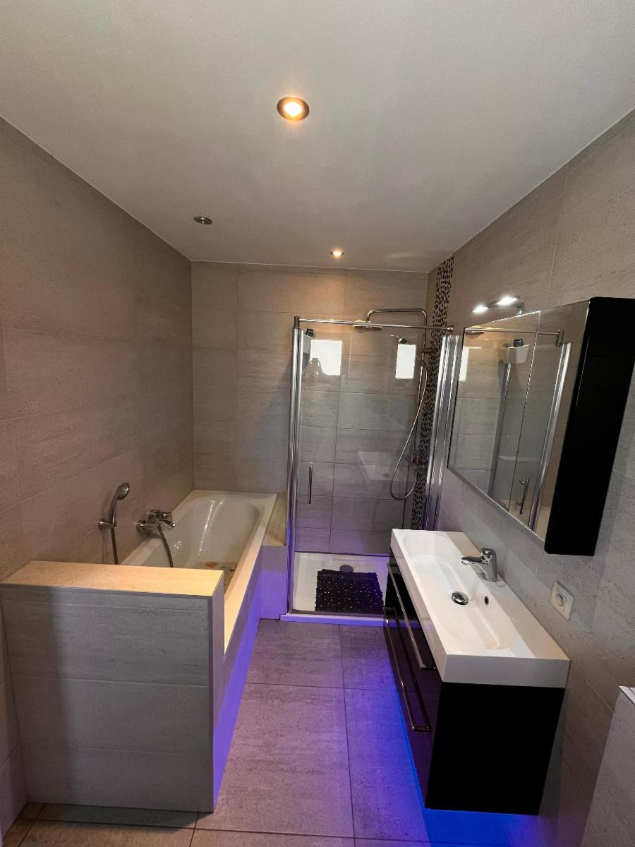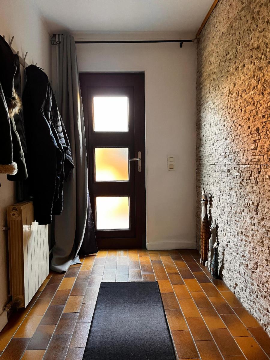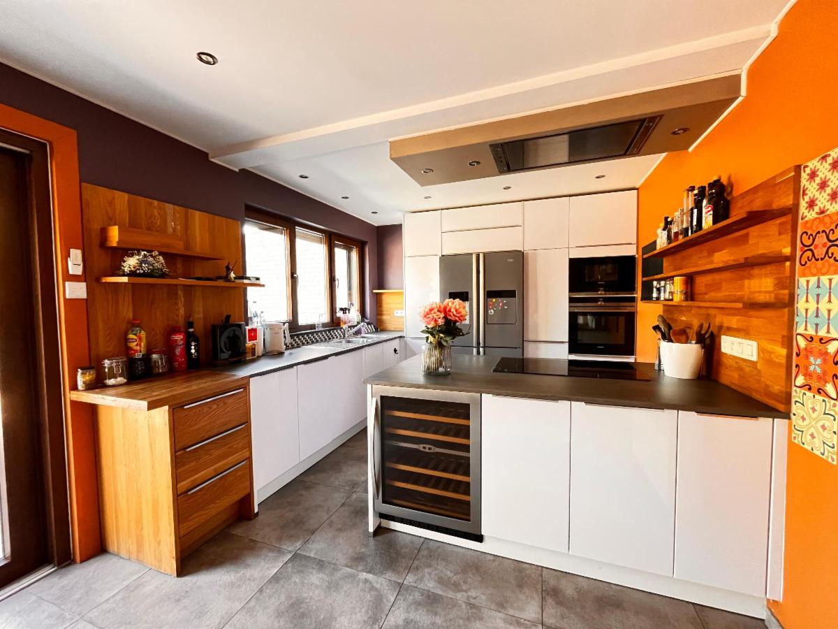 Rez : hall, 1 chambre, living en L, grande cuisine équipée avec coin à manger, cave à vin, buanderie, salle de bains (baignoire, douche, évier, WC), bureau, terrasse en pierre bleue belge, jardin avec étang, abri de jardin, atelier.
