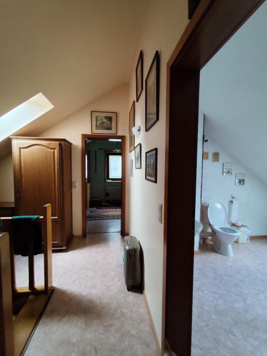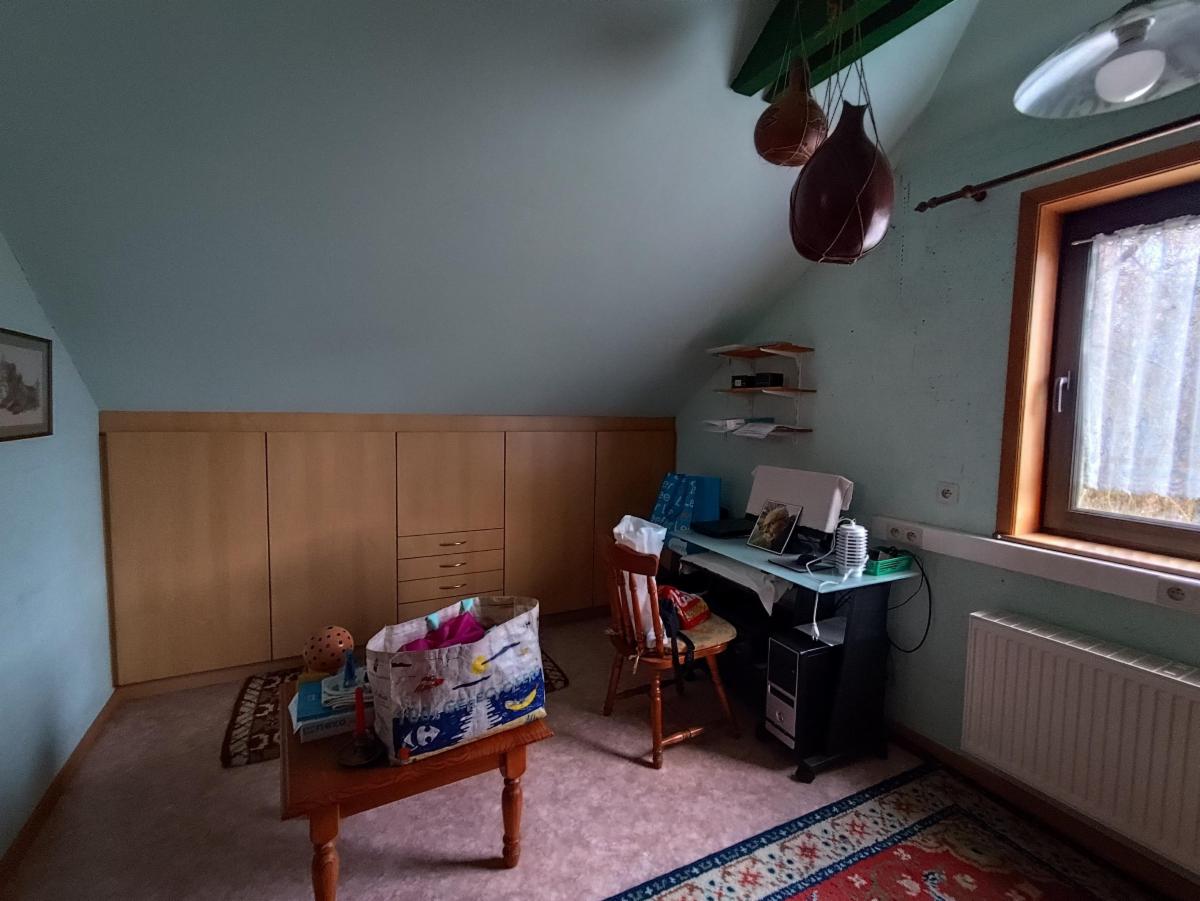 À l’étage, un espace nuit complémentaire se compose d’un bureau avec rangements intégrés, d’une chambre avec grenier aménagé ainsi que d’un WC avec lave-mains.