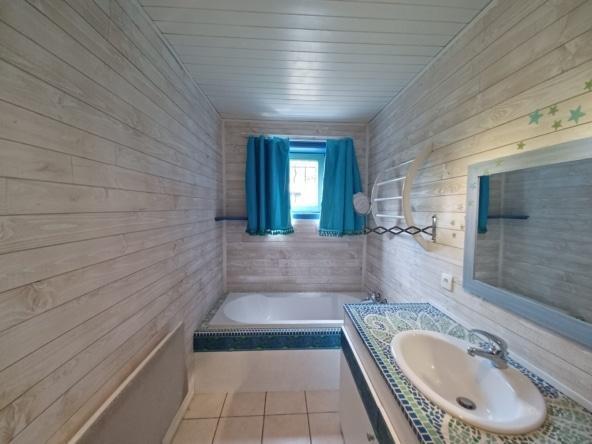 -Rez-de-chaussée : hall d’entrée, salon lumineux, salle à manger, cuisine avec bar (baie vitrée vers le jardin), salle de bain (baignoire, douche, lavabo), garage, wc