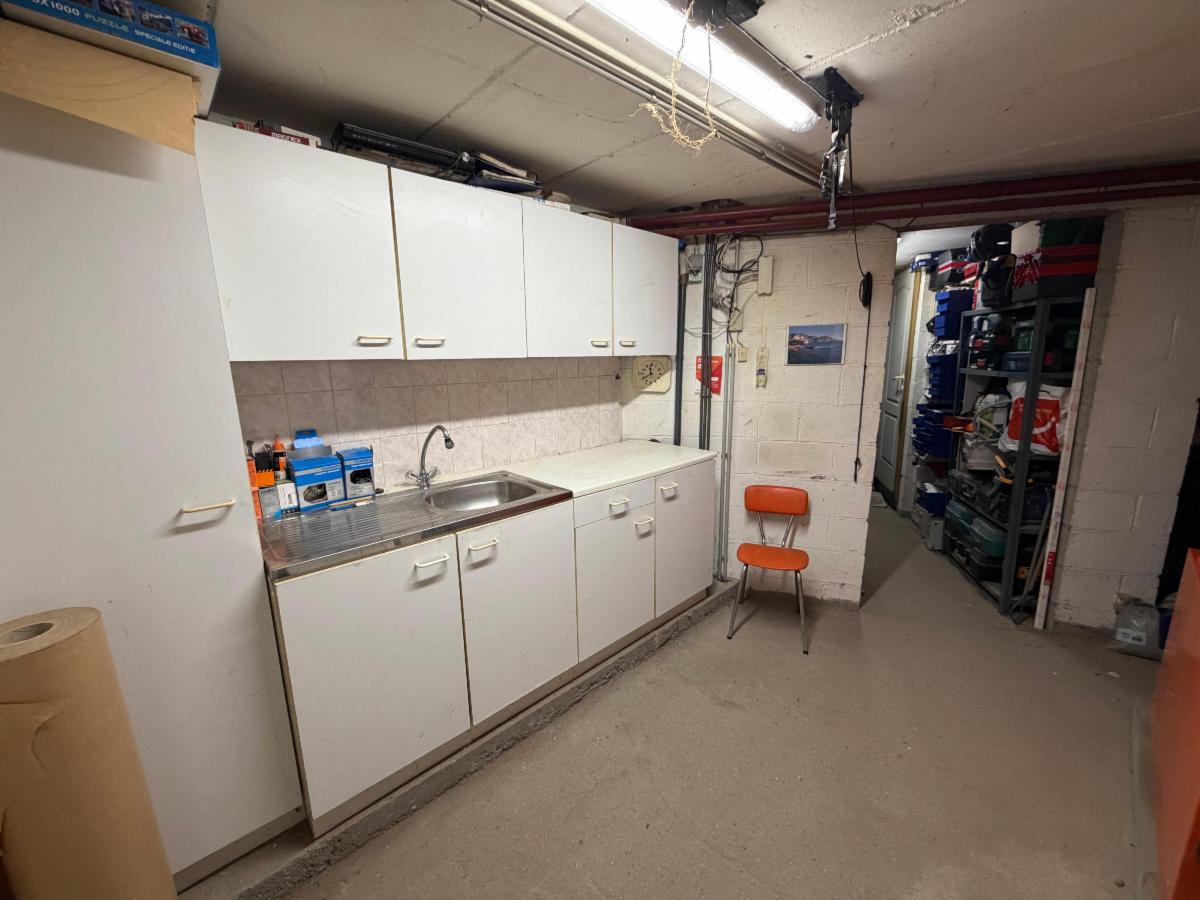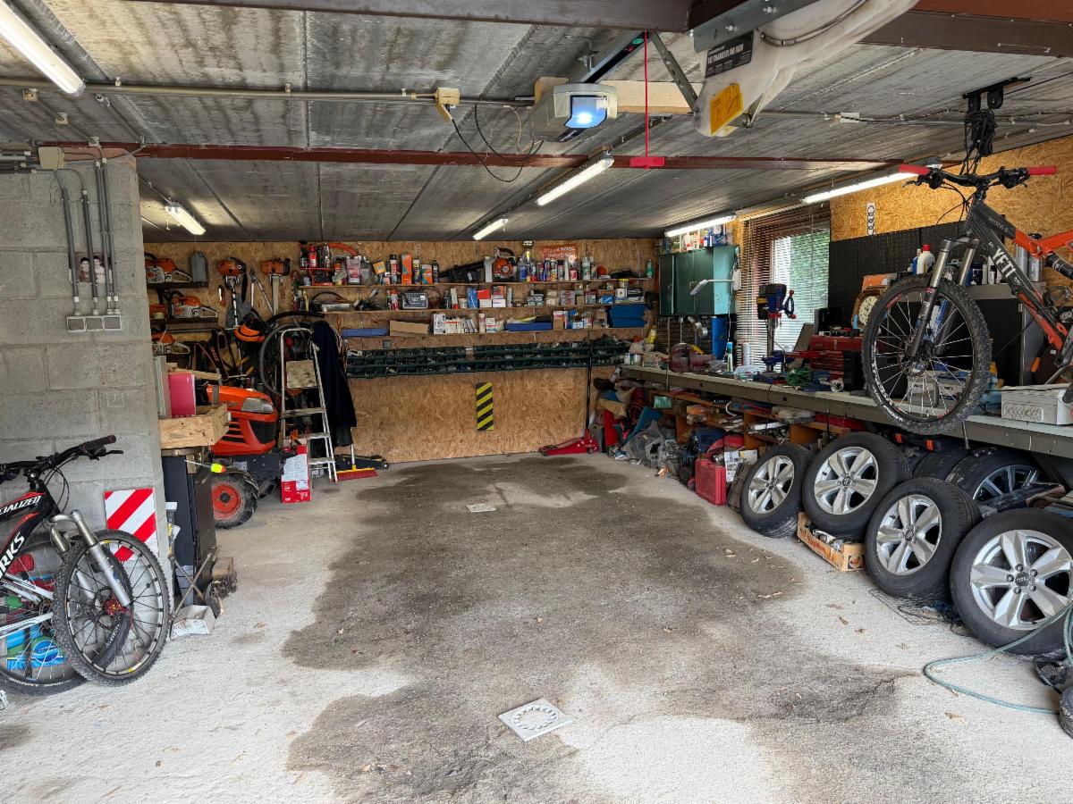 Au premier étage, une grande pièce offre diverses possibilités d’aménagement : bureau, salle de jeux,… tandis qu’au sous-sol (rez-de-chaussée), on retrouve un grand garage (deux emplacements), une buanderie et une cave.