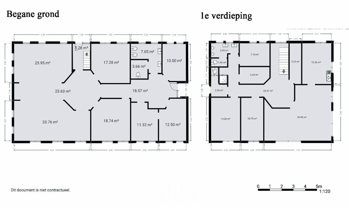Rez-de-chaussée (195 m²) : hall d’entrée, salle d’attente, toilettes, accueil, salle de réception, 3 bureaux séparés, bureau paysager et entrée arrière ;