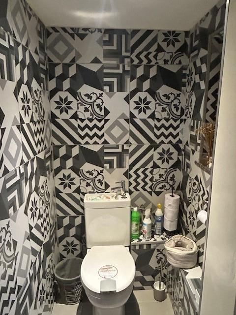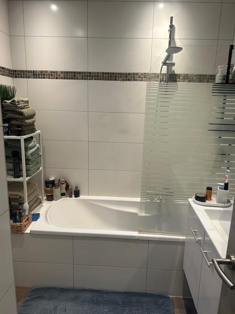 -salle de bains avec baignoire, douche, meuble lavabo et coin rangement/carrelée sol et murs;