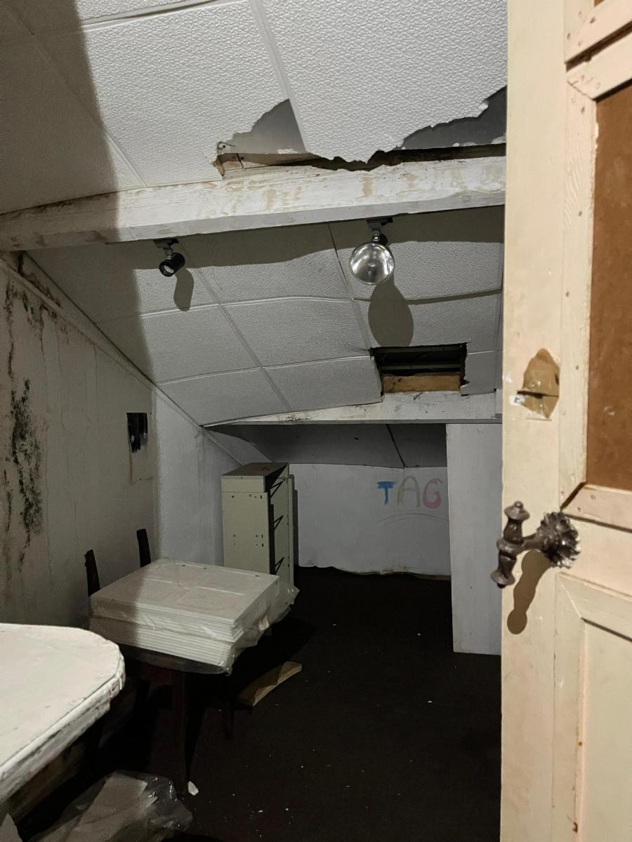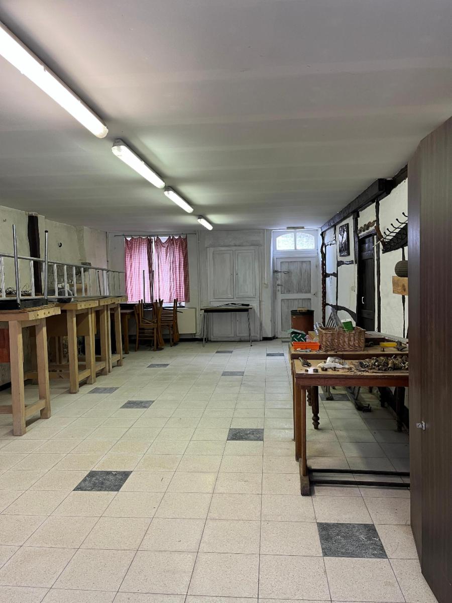 rez : salle des fêtes, grande salle (+- 21x11) avec scène (+- 5 m), bar, cuisine équipée, arrière cuisine, remises et débarras, blocs WC, infirmerie, bloc sanitaire, garage - terrain de basket - terrain bâtissable (zone d'habitat), étage : plusieurs dortoirs mansardés