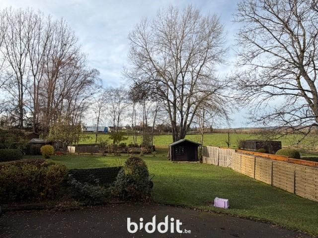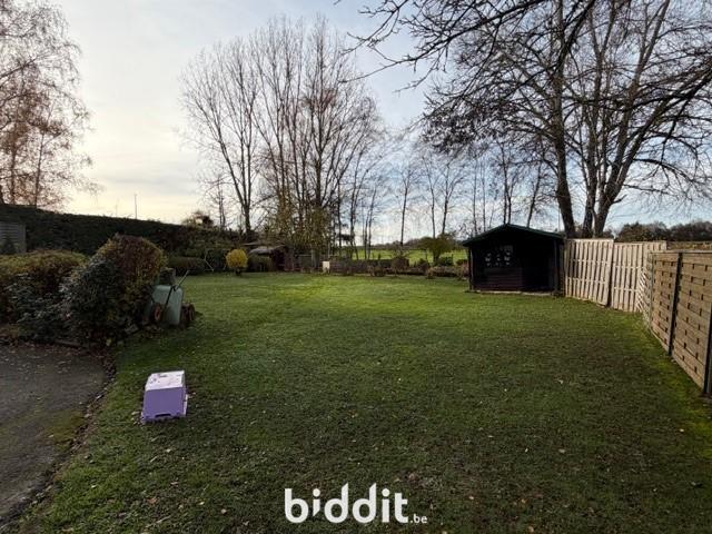 EXTERIEUR : Beau jardin plat avec grand étang et deux abris de jardin - Orienté Ouest - Petit jardinet avant avec Haie pour l’intimité + encore espace devant la haie - Allée de garage menant au garage sis à l’arrière du sous-sol/rez-de-jardin