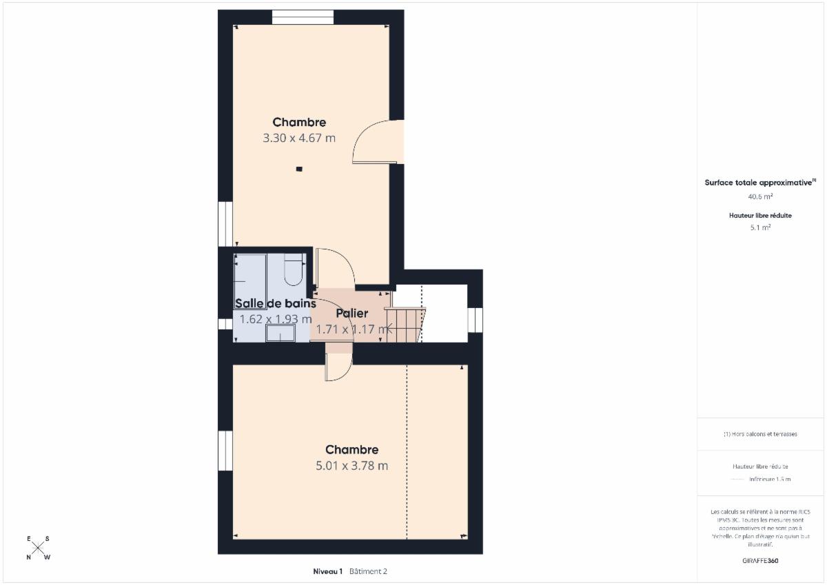 - 1er étage : deux chambres et salle de bains.