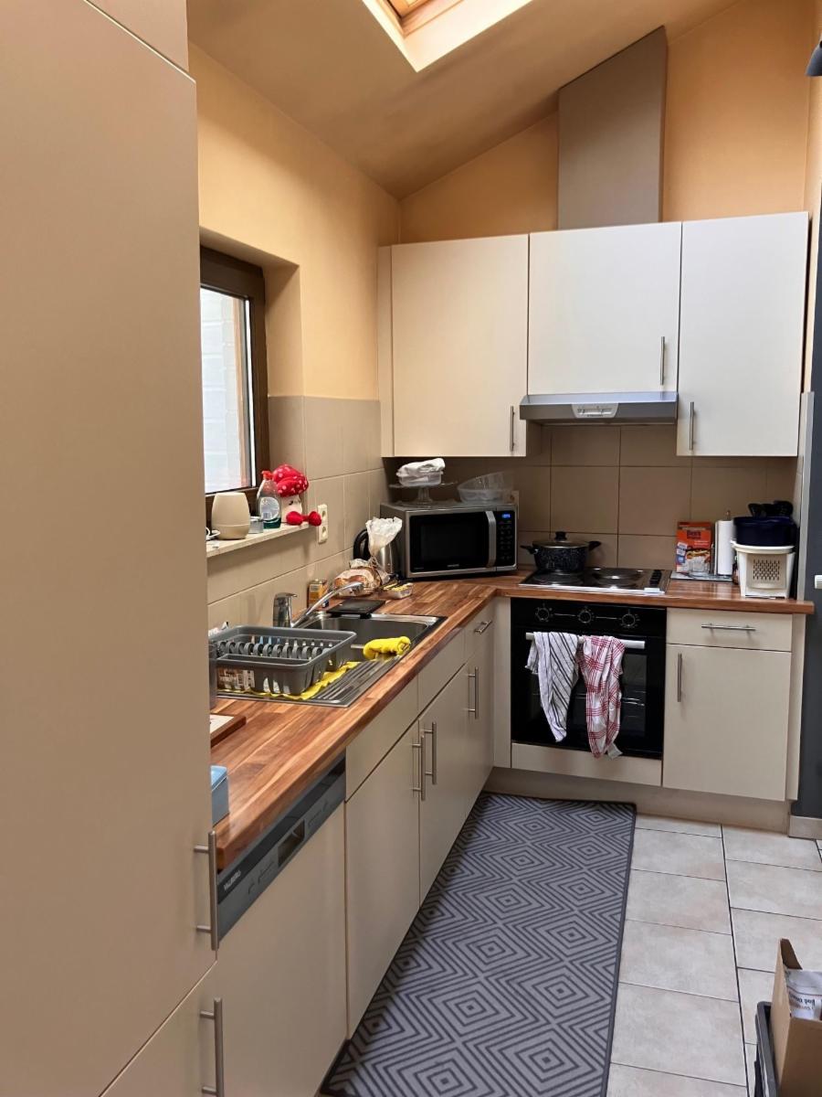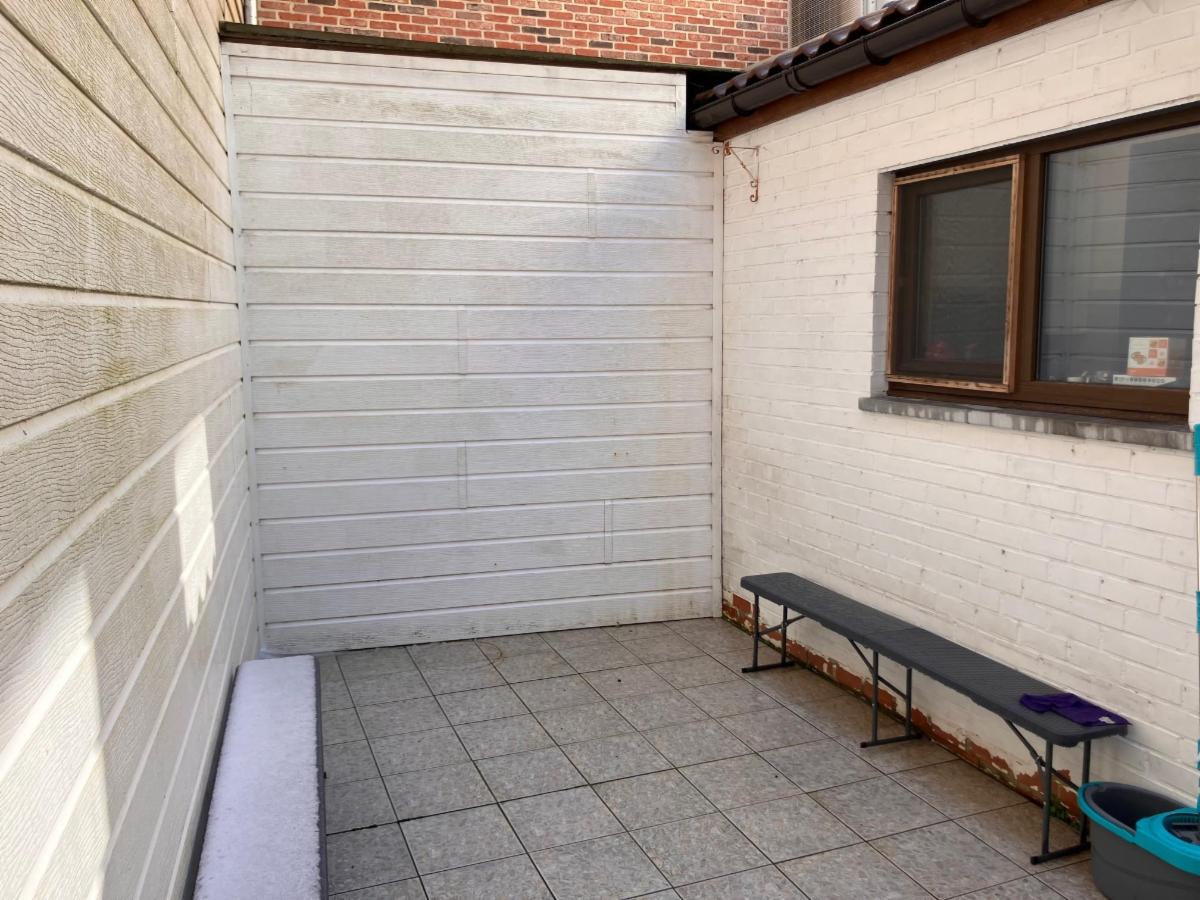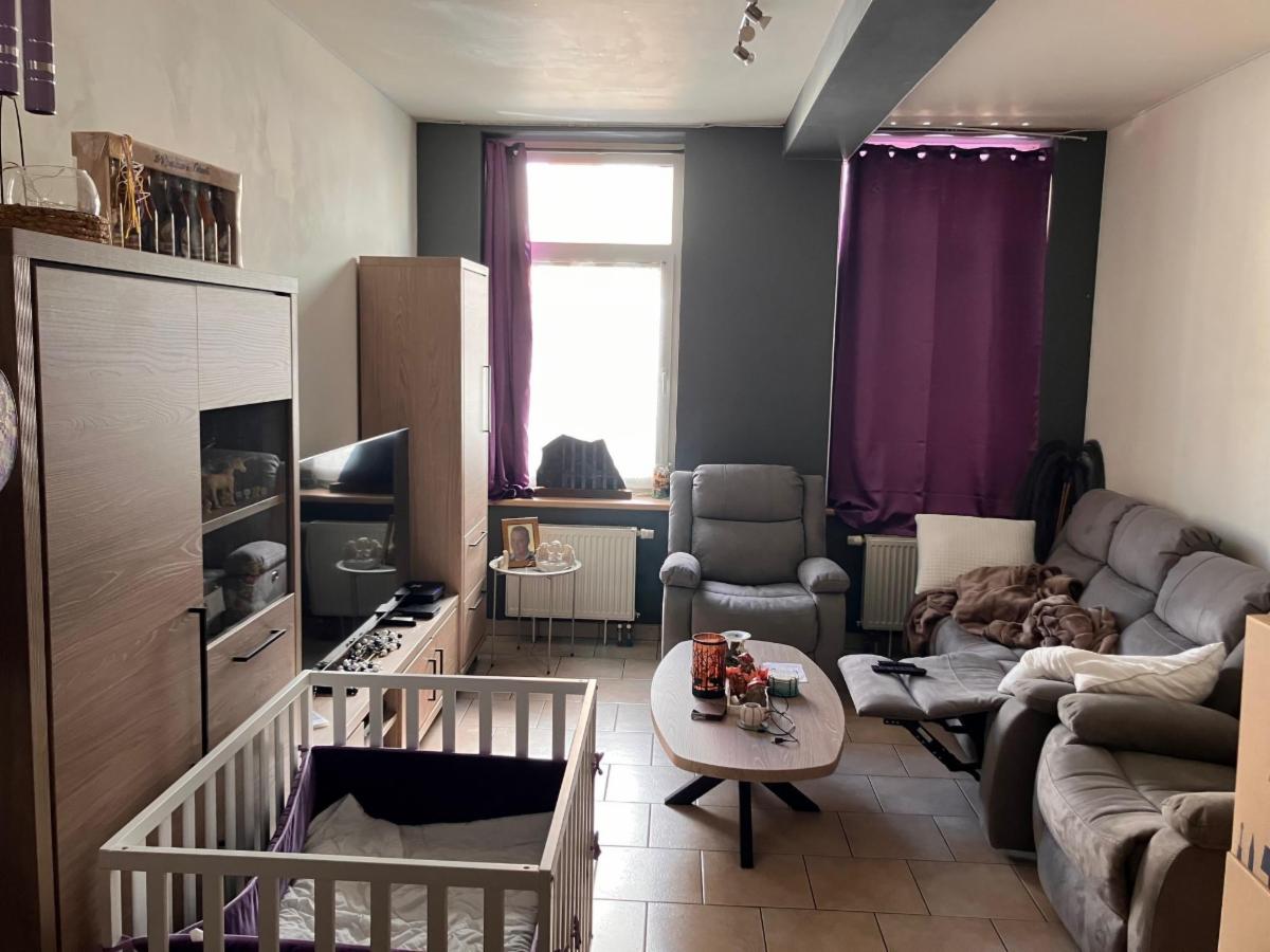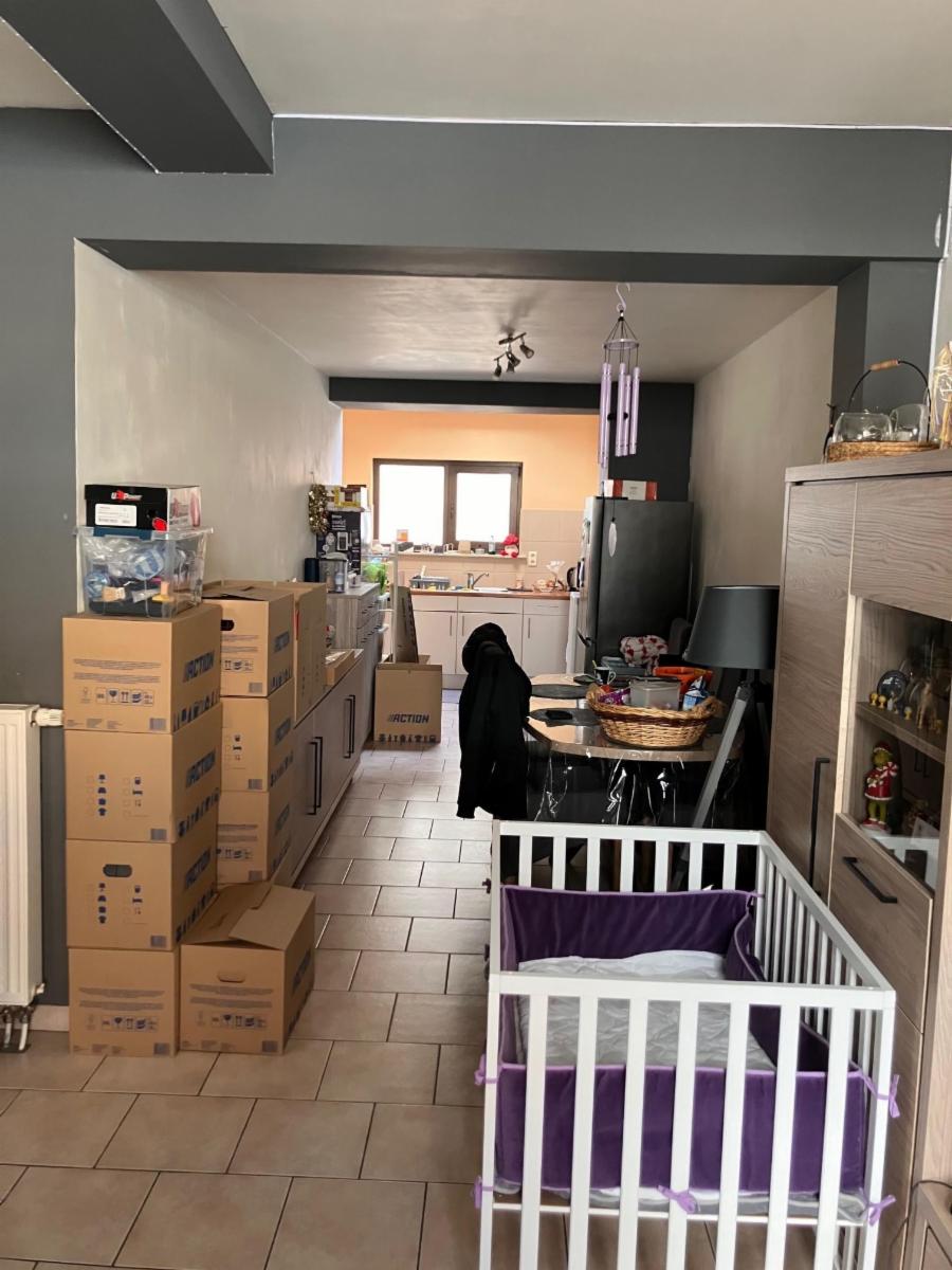 Au RDC: un petit hall d'entrée suivi d'un couloir desservant un vaste living (salon-salle à manger) avec cuisine ouverte et équipée, un wc.