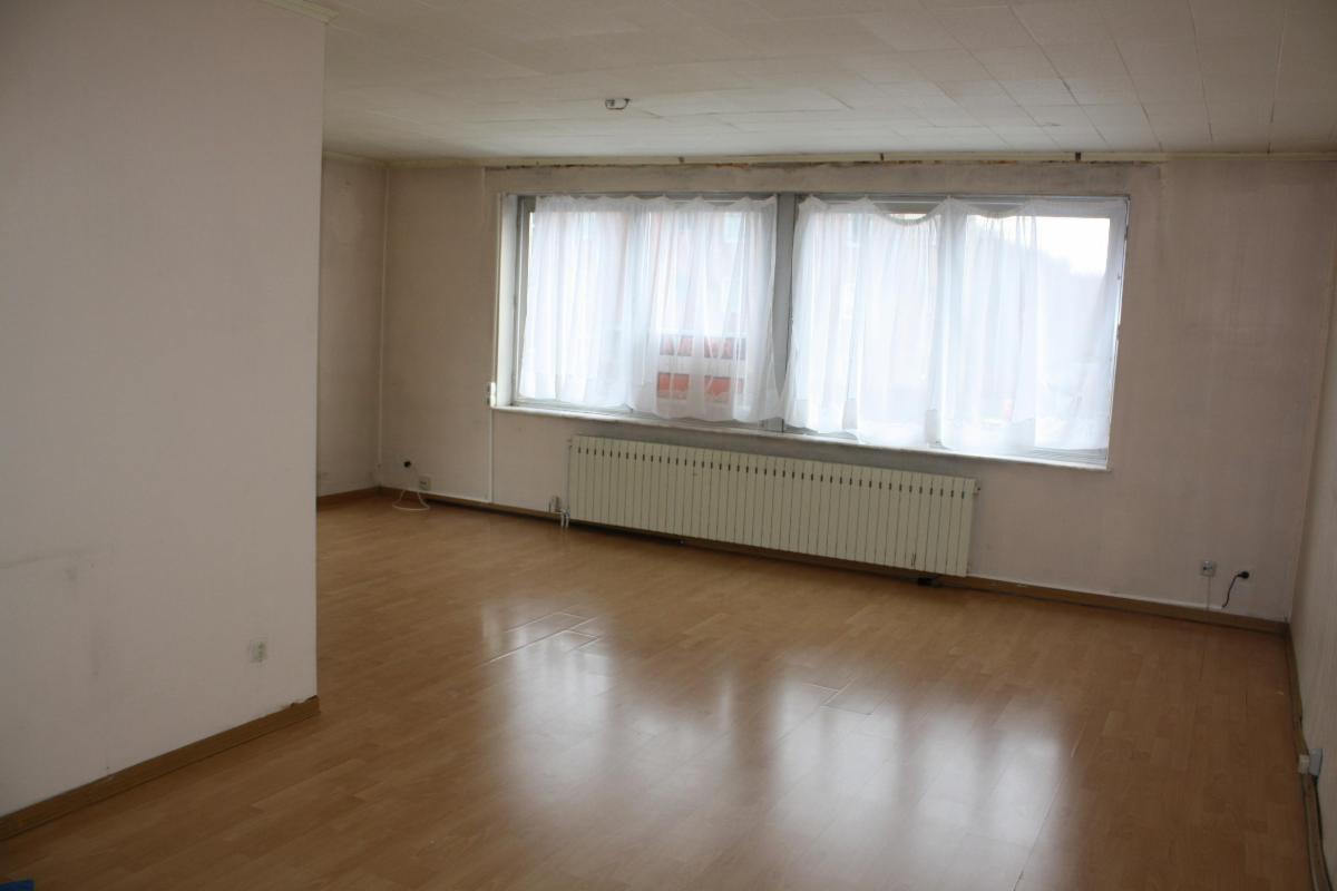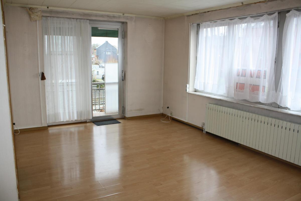 • un hall d’entrée, une chambre sur l’arrière, une deuxième chambre sur l’arrière, une salle de bain avec baignoire + évier, un wc séparé avec évier, une cuisine semi-équipée avec bac évier + cuisinière avec four et plaques électriques – un living et salle à manger en L avec un balcon en façade (équipé d’une tente solaire) ;