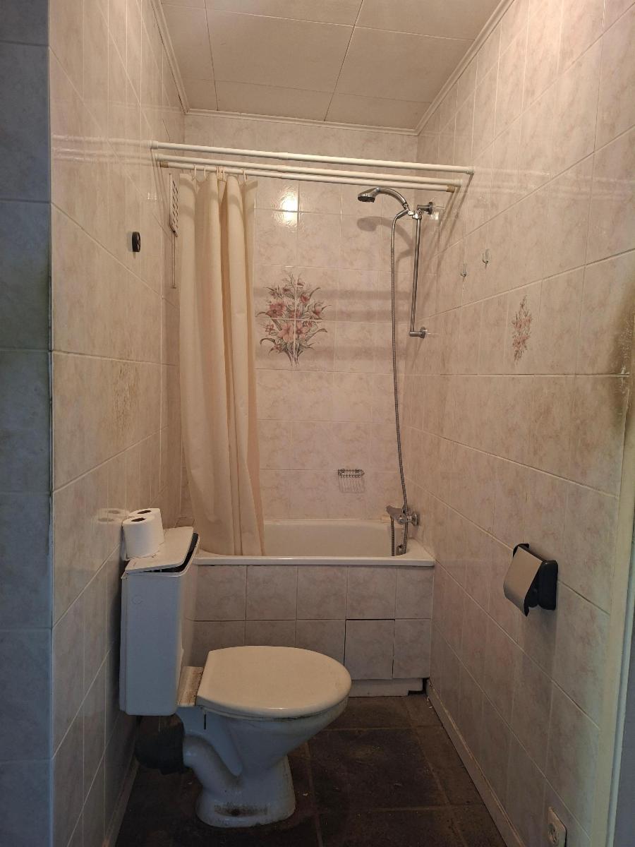 Salon, salle à manger, une chambre, cuisine, salle de bains avec baignoire et wc, petit balcon, cave et garage