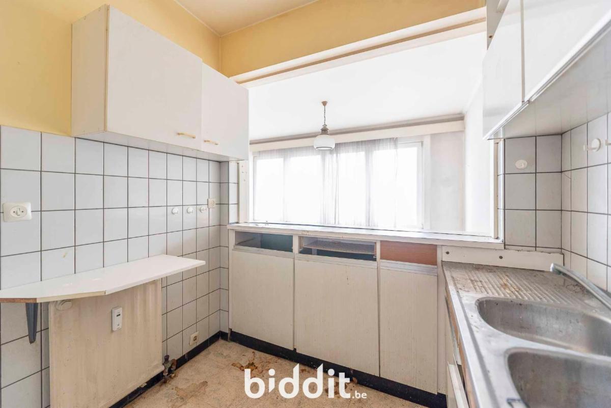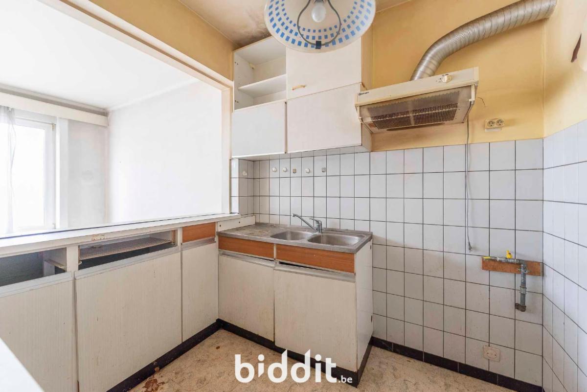 Het appartement omvat een ruime leefruimte met grote raampartijen die zorgen voor veel natuurlijke lichtinval. Aansluitend bevindt zich de keuken, momenteel ingericht met een eenvoudige, verouderde uitrusting en afgescheiden van de leefruimte via een doorgeefopening. Deze ruimte biedt duidelijk potentieel voor modernisering.