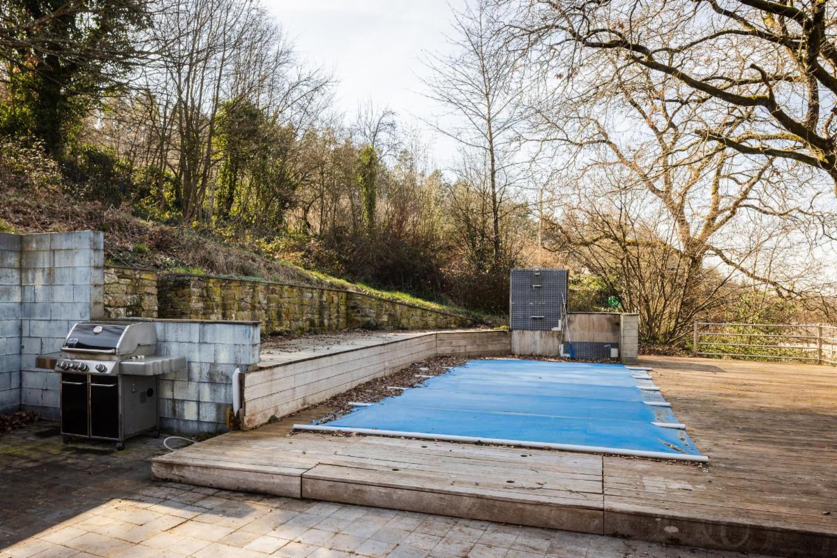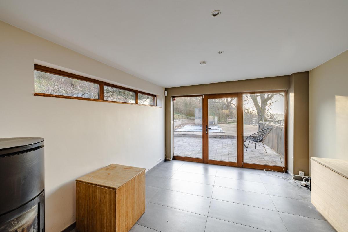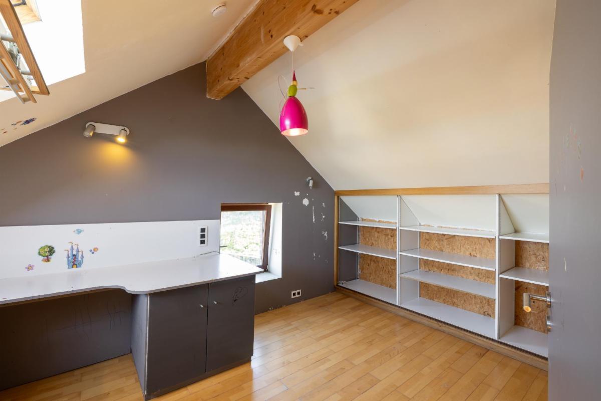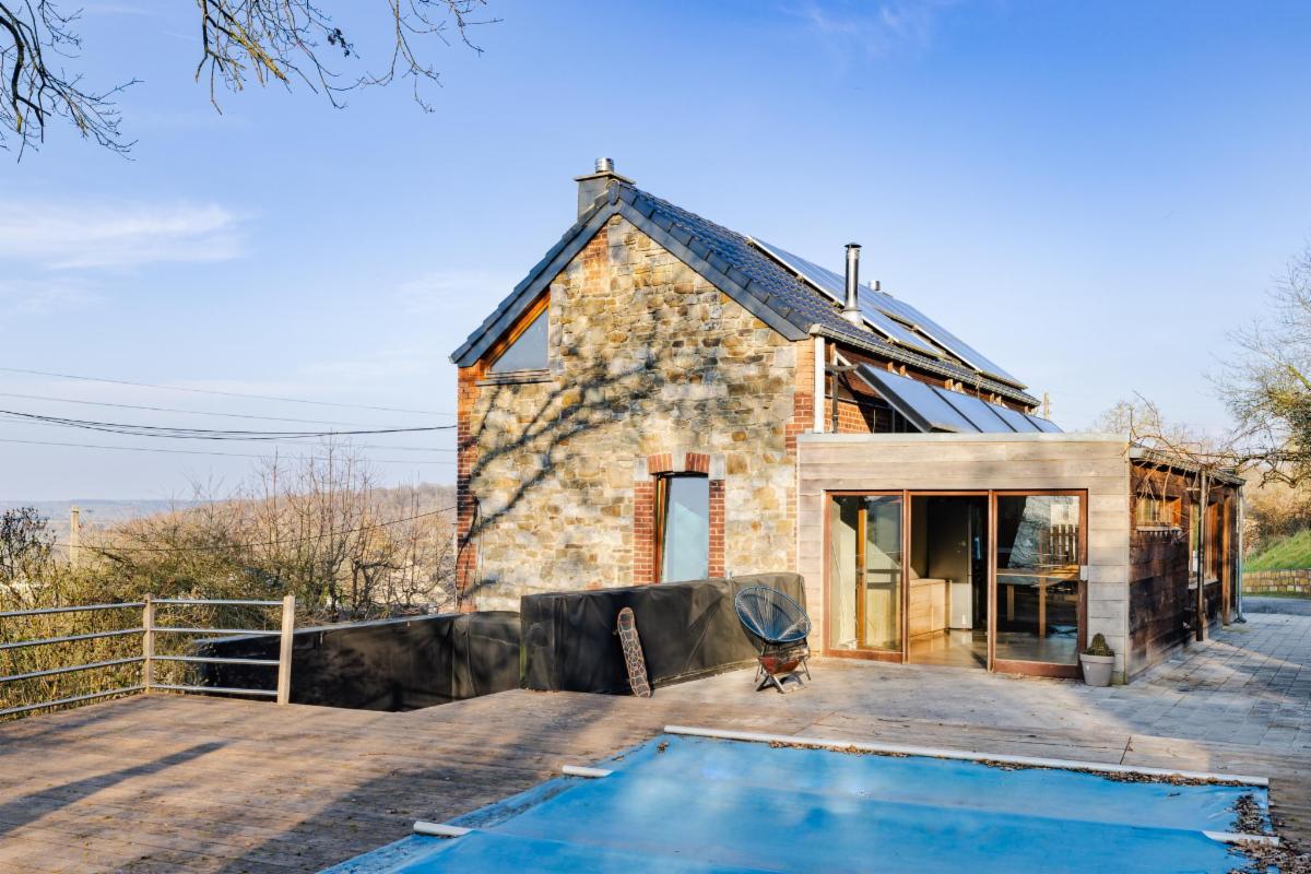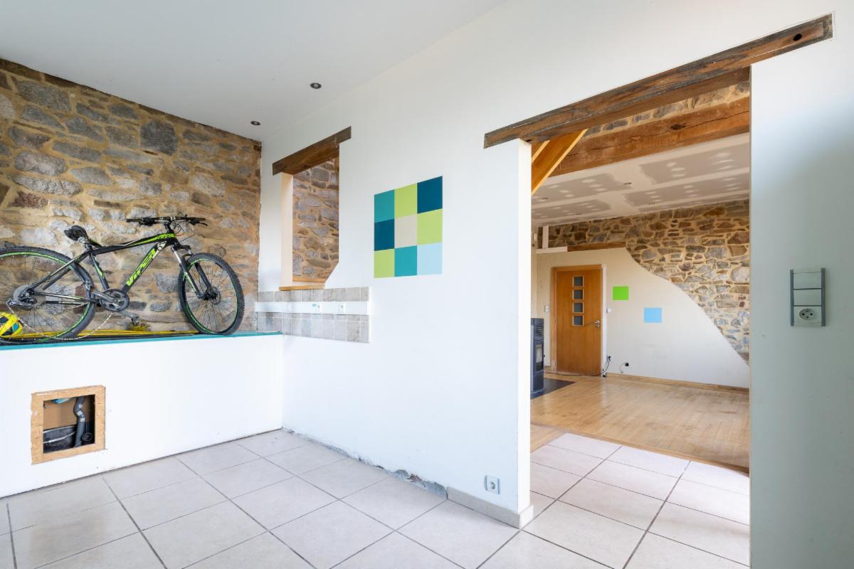 Belle maison 4 façades en brique à vendre à Kin-Stoqueu avec une belle grande terrasse et une piscine, composée au rez-de-chaussée d'une grande pièce qui servait auparavant comme living avec escalier vers les pièces de vie à l'étage, d'une ancienne cuisine et d'une annexe compremant la chaufferie. Au premier étage, d'un hall avec escalier vers le deuxième étage, cuisine ouverte dans l'annexe avec portes fenêtres tant vers le parking, que vers la terrasse et la piscine, de deux chambres, et d'une salle de bains. Au deuxième étage, d'un vaste grenier aménagé en chambre avec dressing et/ou bureau attenant. Belle grande terrasse. Piscine. Petit parking au niveau du pignon est à côté de la porte d'entrée et deuxième parking avec allée d'accès jusqu'à l'annexe. Belle vue sur la vallée. Proximité des grands axes autoroutiers (Liège-Luxembourg) et proche du centre d'Aywaille. Chaudière au mazout qui n'est plus active. Deux poeles à pellets. Panneaux photovoltaïques. Electricité non conforme mais possibilité de s'arranger avec le propriétaire pour qu'elle le soit. Un verger de 220m² en face de la maison est également compris dans la vente. Visites sur rendez-vous préalable avec l'étude au 04/384.48.41.