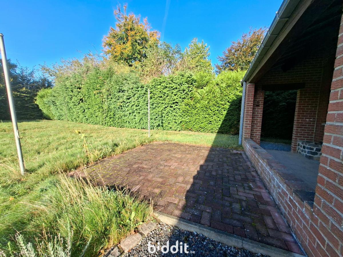 Beau jardin entourant la maison, agréable terrasse couverte et possibilité de stationner 2 véhicules devant le garage.