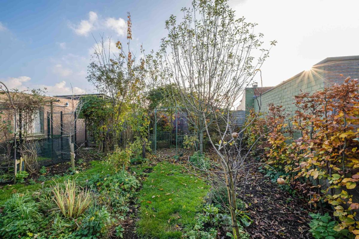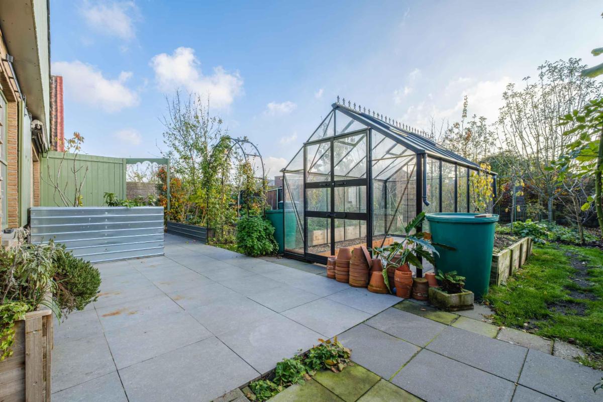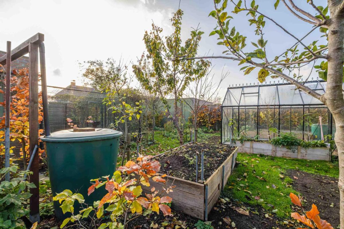 Volledig omheinde tuin (zuid georiënteerd) met serre, fruitbomen en bessenstruiken.
