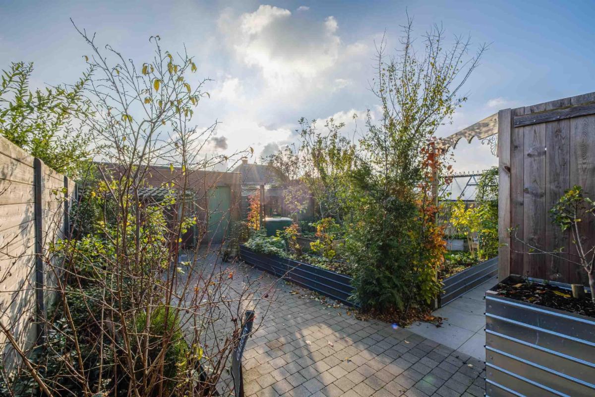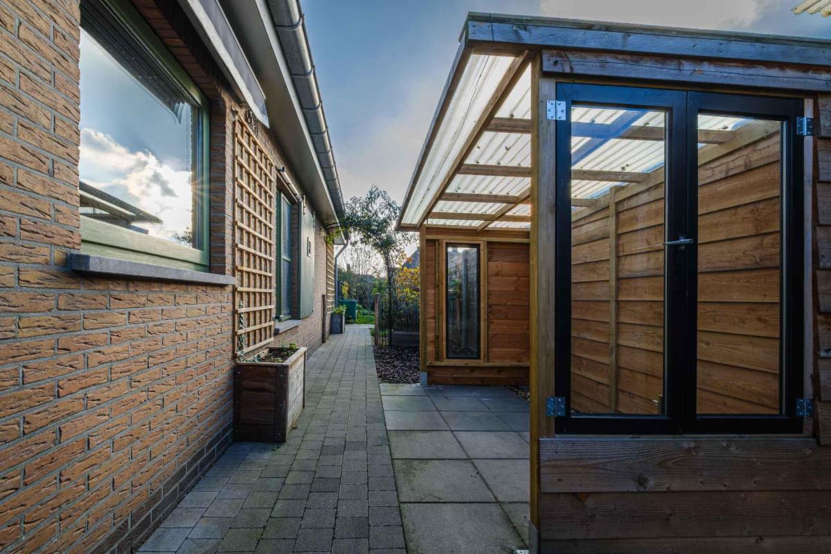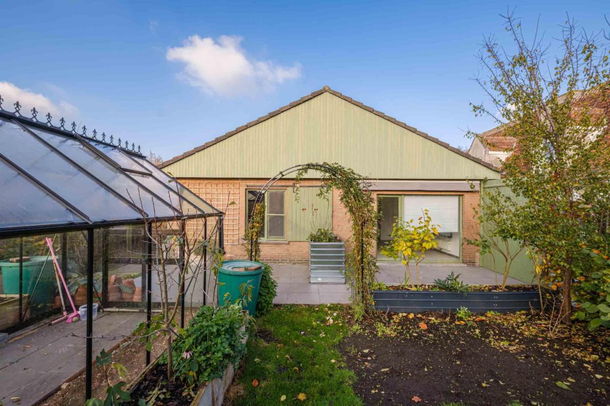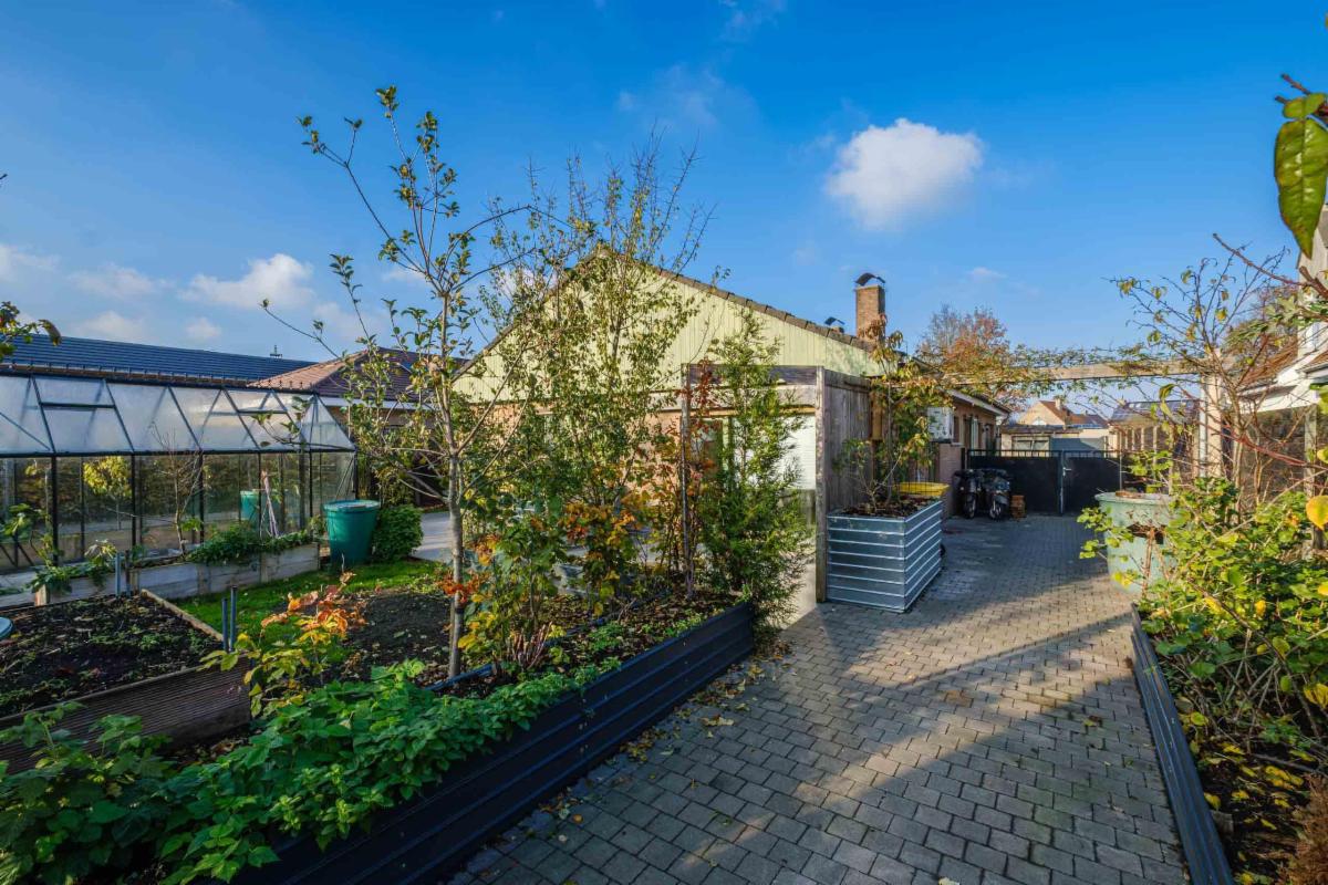 Volledig omheinde tuin (zuid georiënteerd) met serre, fruitbomen en bessenstruiken.