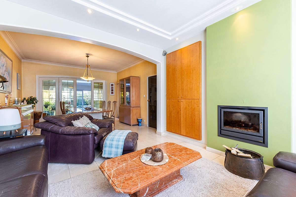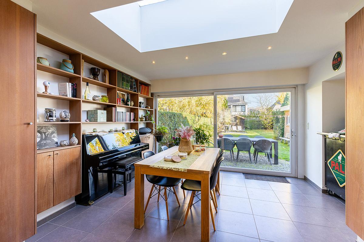 Via de inkomhal met gastentoilet en toegang tot de kelder kom je binnen in de gezellige woonkamer. De houtkachel en ingemaakte kasten zorgen voor sfeer en functionaliteit. Aanpalend vind je een lichtrijke uitbouw met lichtkoepel en groot schuifraam naar het terras en de tuin met oostelijke oriëntatie. Hier geniet je elke ochtend van de eerste zonnestralen.