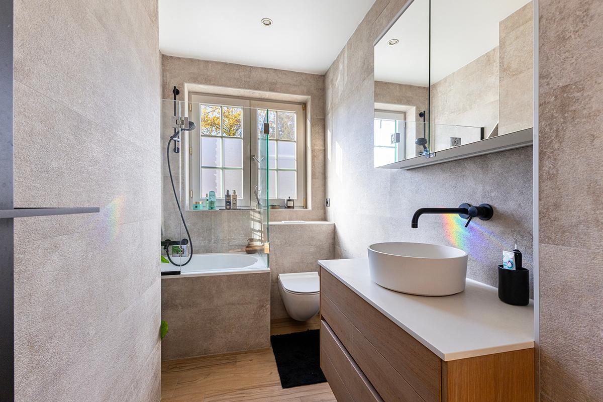 De badkamer werd in 2020 nog vernieuwd en beschikt over een ligbad, lavabo en toilet. Via een wenteltrap bereik je de zolder, een mooie open ruimte die zich leent tot hobbykamer, extra slaapkamer of bureau.