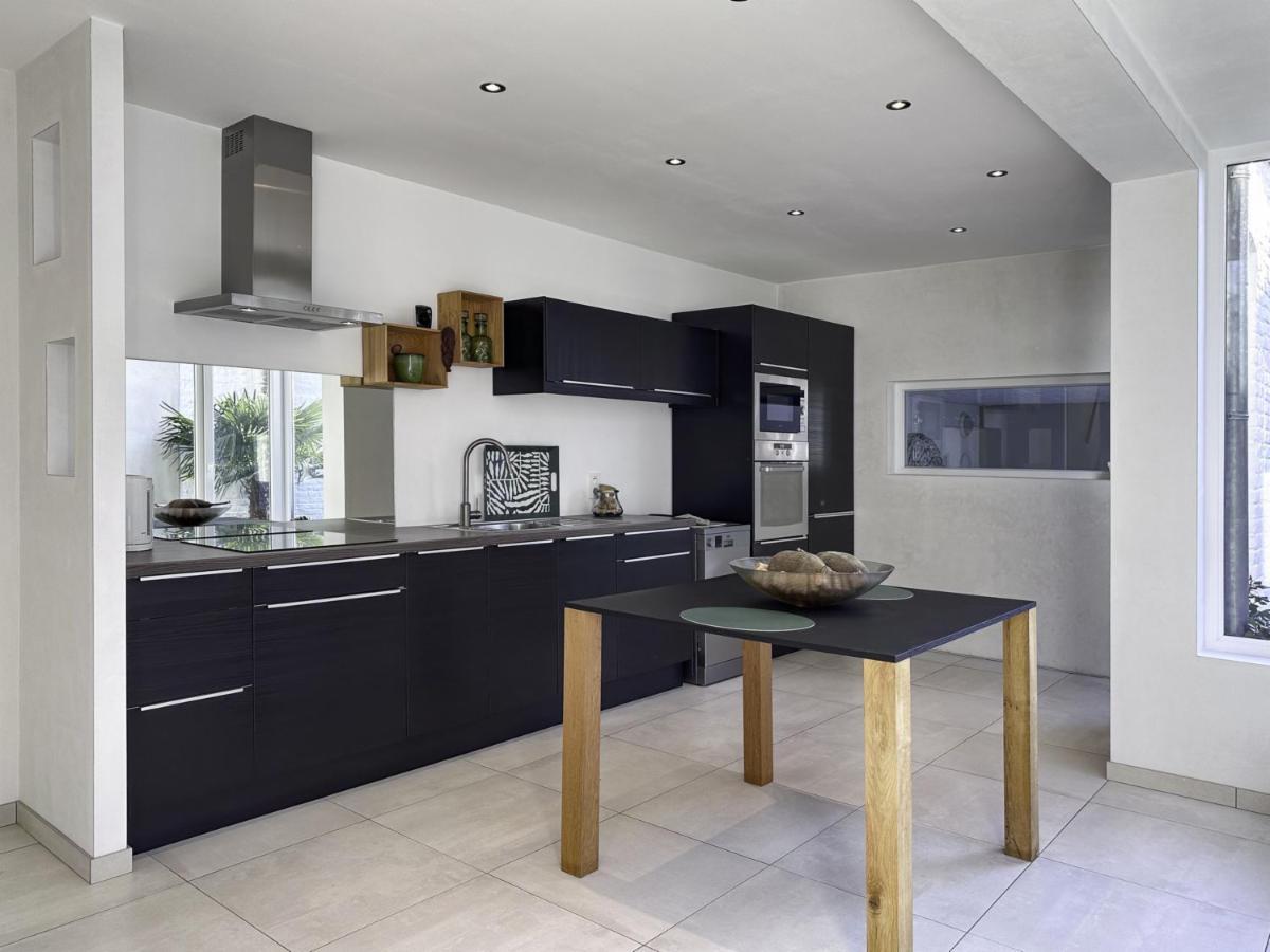 sur mesure de plus de 3 mètres offrant une vue exceptionnelle sur le jardin, salle à manger, cuisine