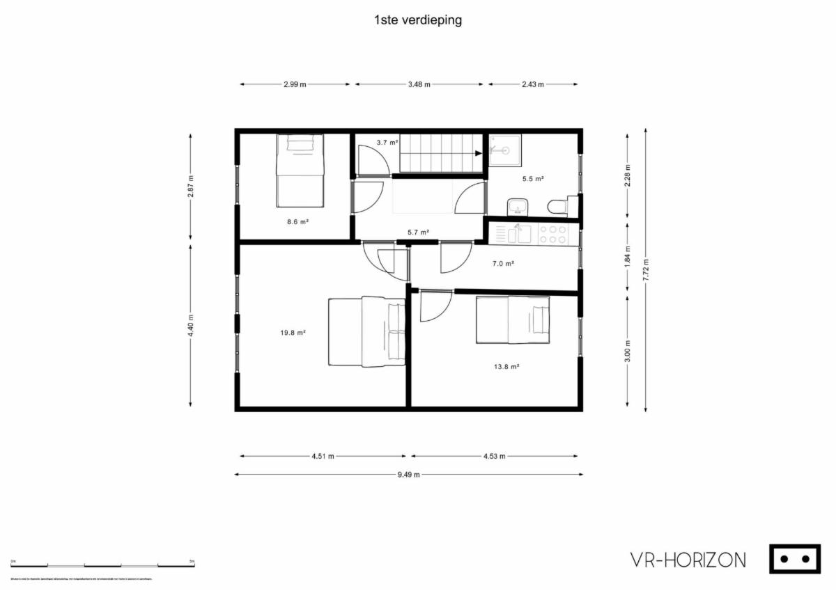 Eerste verdieping: gang, 3 slaapkamers, badkamer, keuken, 2 bergingen.
