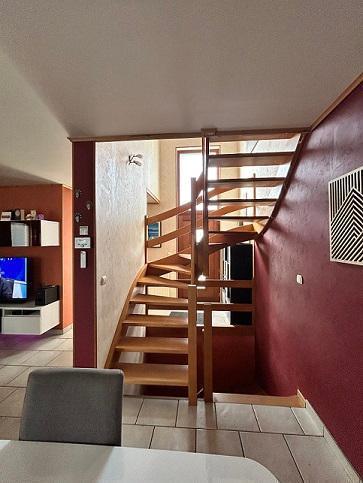 Un escalier en bois à claire-voie, central et lumineux, relie harmonieusement les étages.