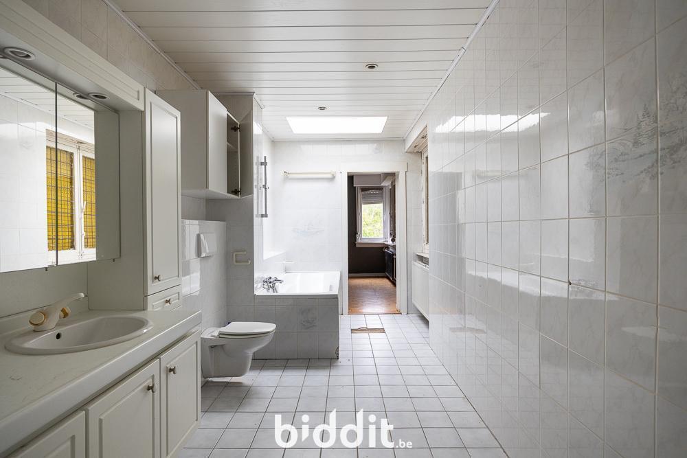 - 1e verdieping: overloop, 2 slaapkamers, wasplaats met douche, badkamer (ligbad, 2 lavabo's, wc), 3e slaapkamer bereikbaar via de badkamer. G score: A P score: A