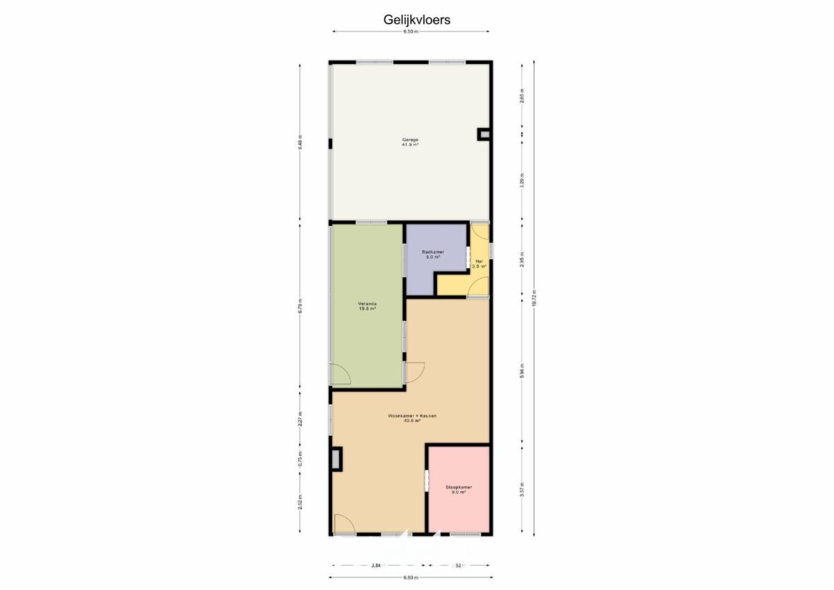 Omvat: keuken, woonkamer, badkamer, slaapkamer, veranda en garage en op de 1e etage een zolderruimte.