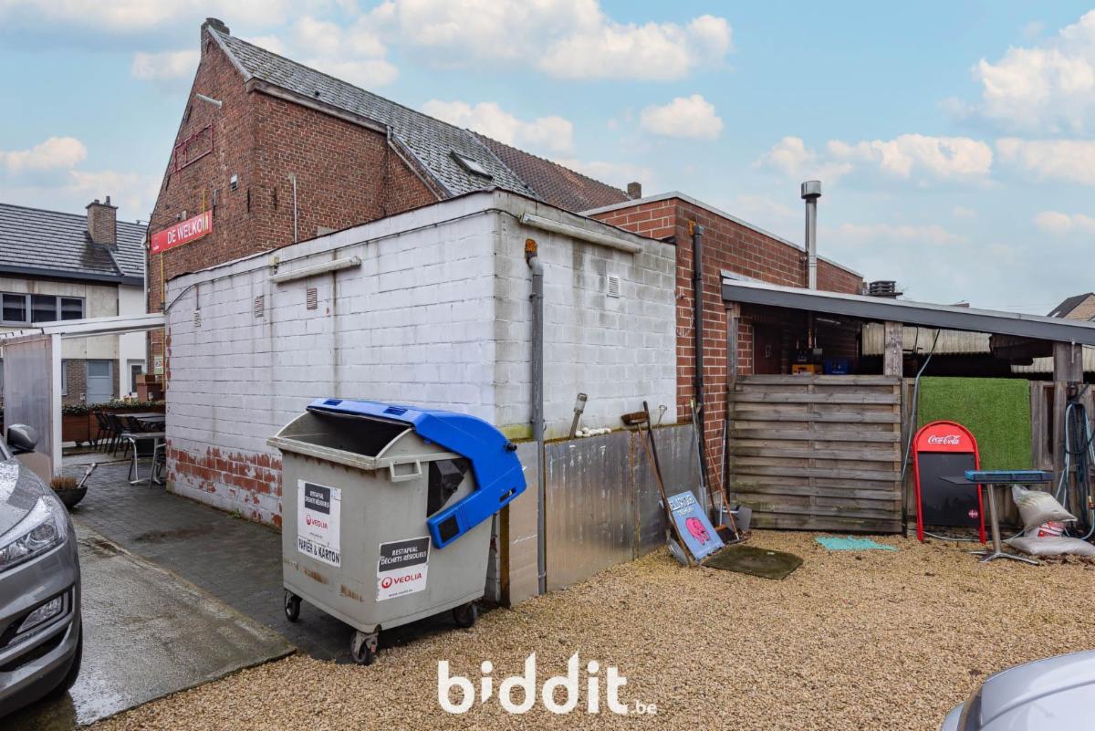 Een handelshuis met overdekte koer/opslagplaats, garage toegankelijk via achterliggende straat en een aangrenzend perceel grond met achteraan 2 metalen garageboxen.