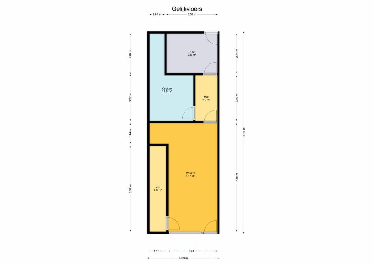 Het gelijkvloers wordt gebruikt als handelsruimte en is ingedeeld als volgt: