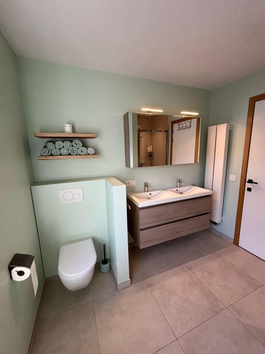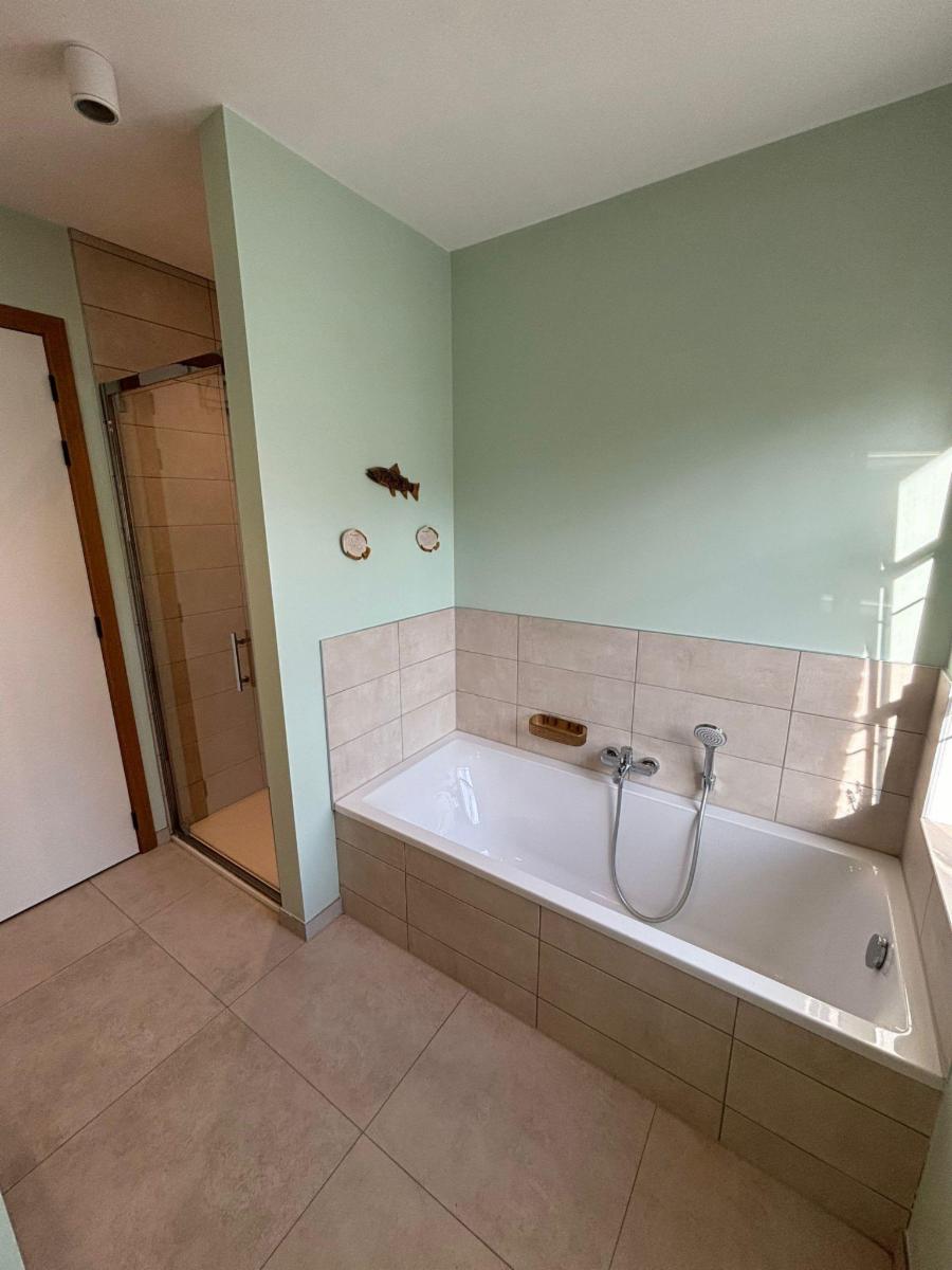 - Badkamer met dubbele lavabo, bad, douche en een tweede toilet