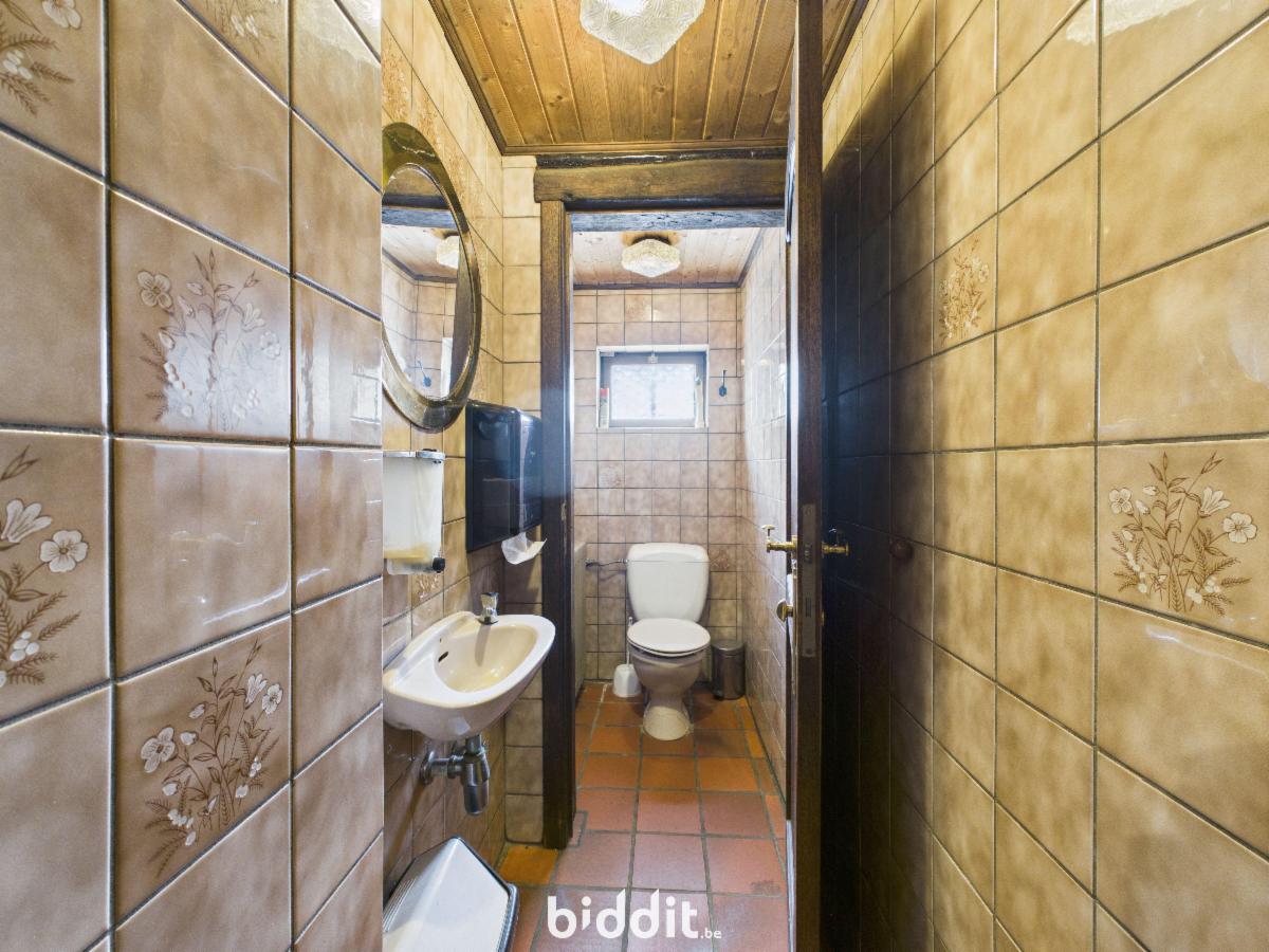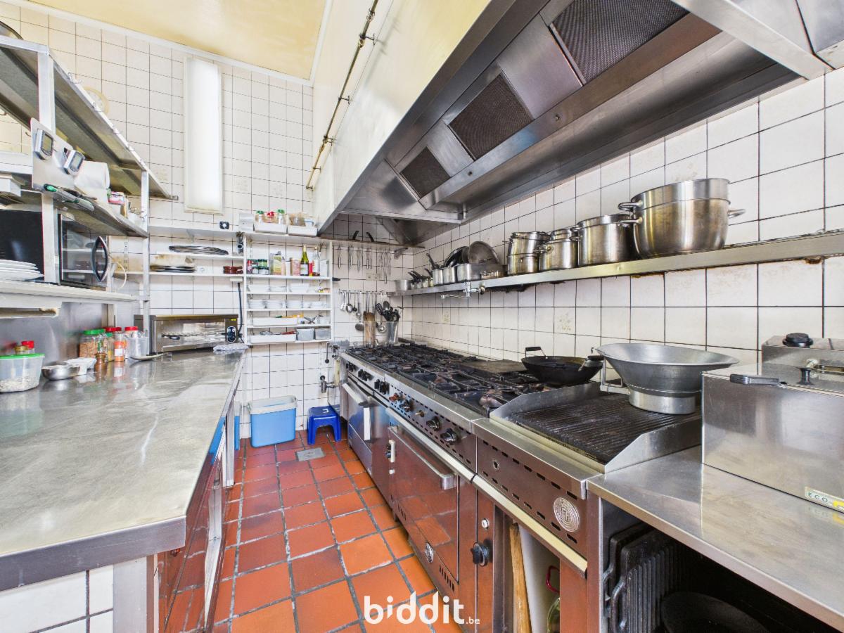 Rez-de-chaussée (128 m²)**: Un sas d’entrée distribuant une surface commerciale à usage de salle de restaurant, d’un bloc sanitaire homme/dame, d’une cuisine professionnelle et un accès à une cour arrière de ± 9 m² avec WC séparé.