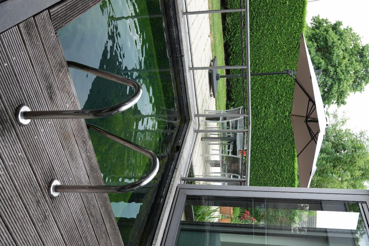 -Gelijkvloers: een inkomhal met gastentoilet, een slaapkamer/kantoor, een ruime leefruimte met zicht op de zuidwest georiënteerde tuin, met zwemvijver met biofilter en zonnige terrassen, en een volledig ingerichte open keuken met aansluitend een dubbele berging/wasruimte. Wellness met sauna, douche en toilet en een tweede zitruimte met bureauruimte (en houtcassette).