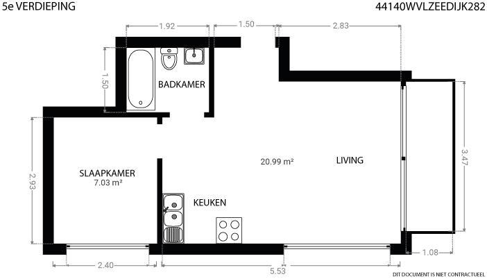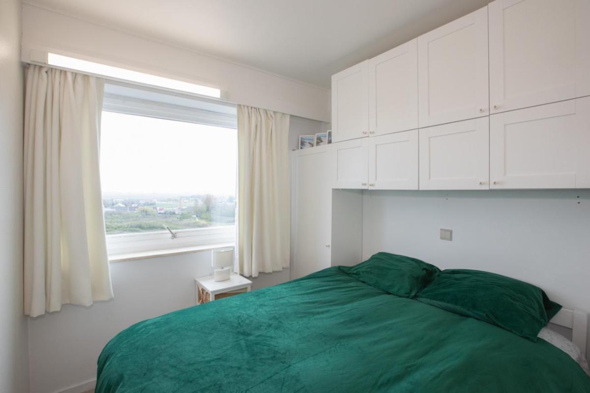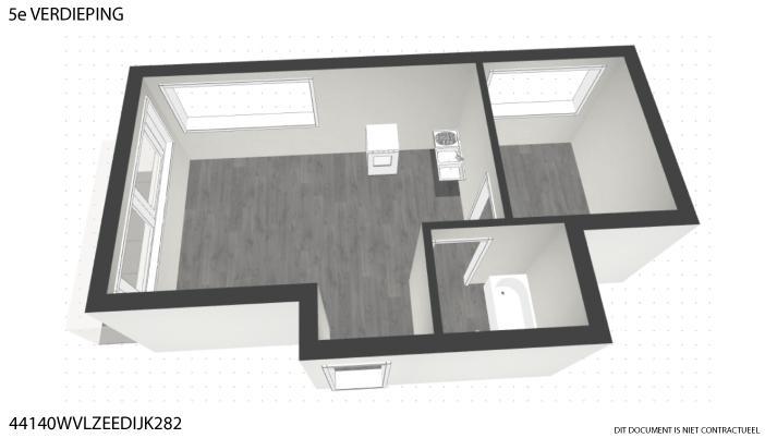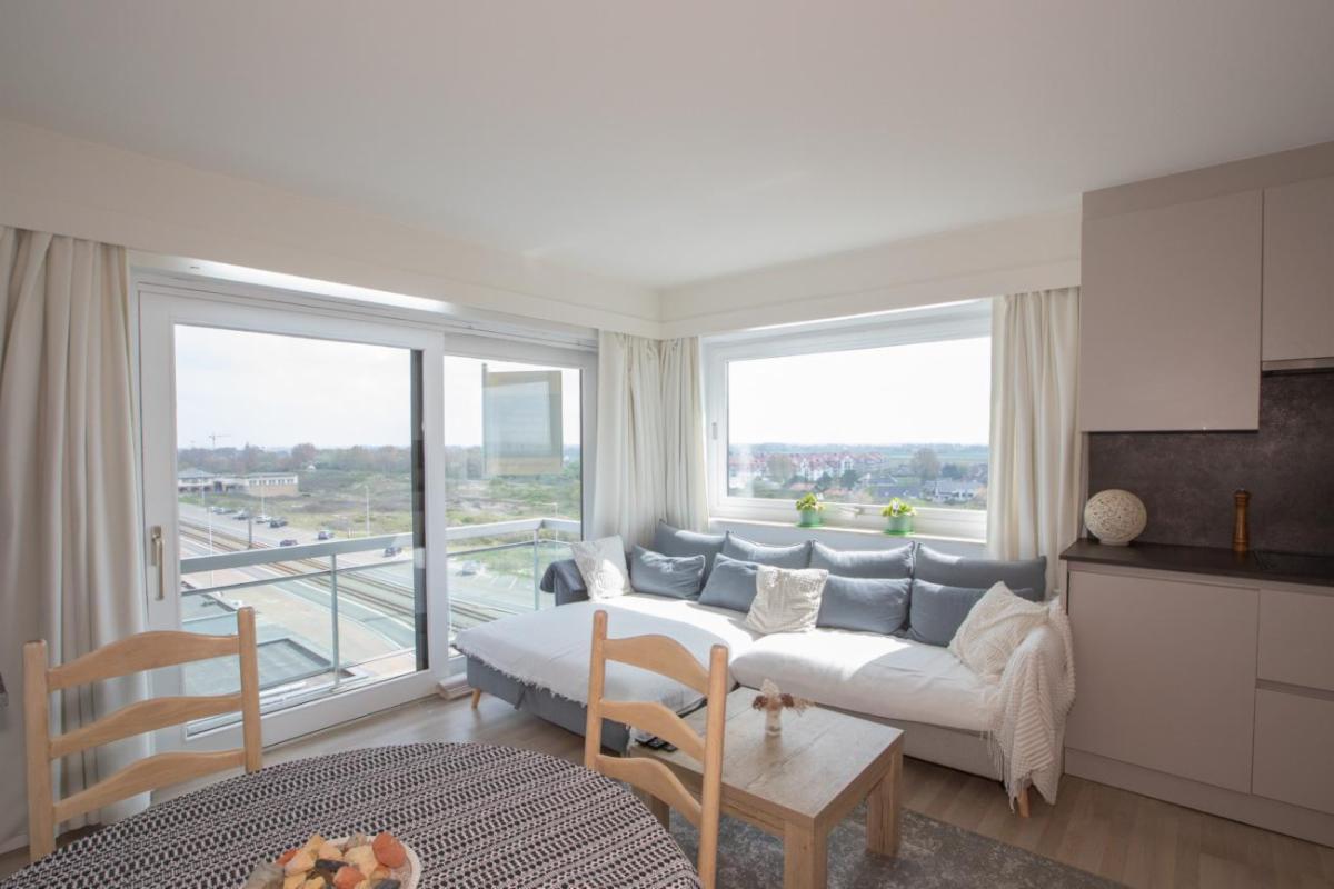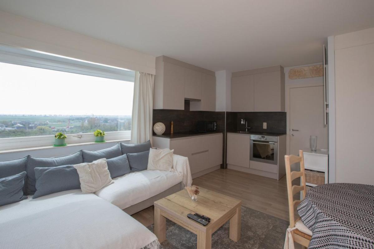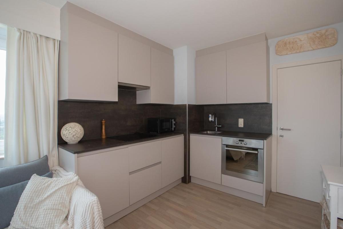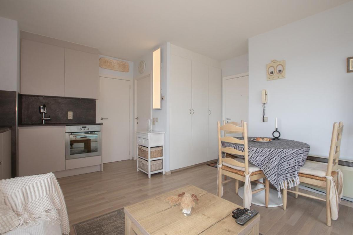 Het appartement is gelegen op de vijfde verdieping van residentie Twins en omvat: de inkom met vestiaire, woonkamer met keukenhoek uitgevend op een terras kant Kwinstraat en Leopoldlaan, toiletkamer met bad en wc, slaapkamer uitgevende op Leopoldlaan.