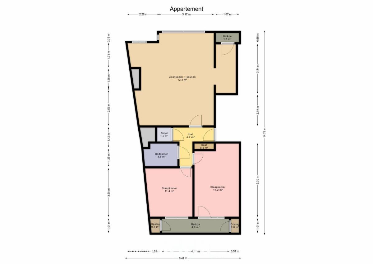 Indeling: hall met ingemaakte kast, woonkamer, keuken, wc, badkamer, 2 slaapkamers waarvan 1 met balkon.