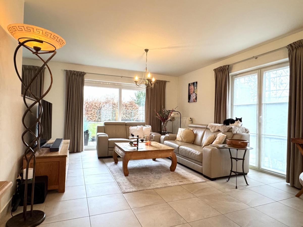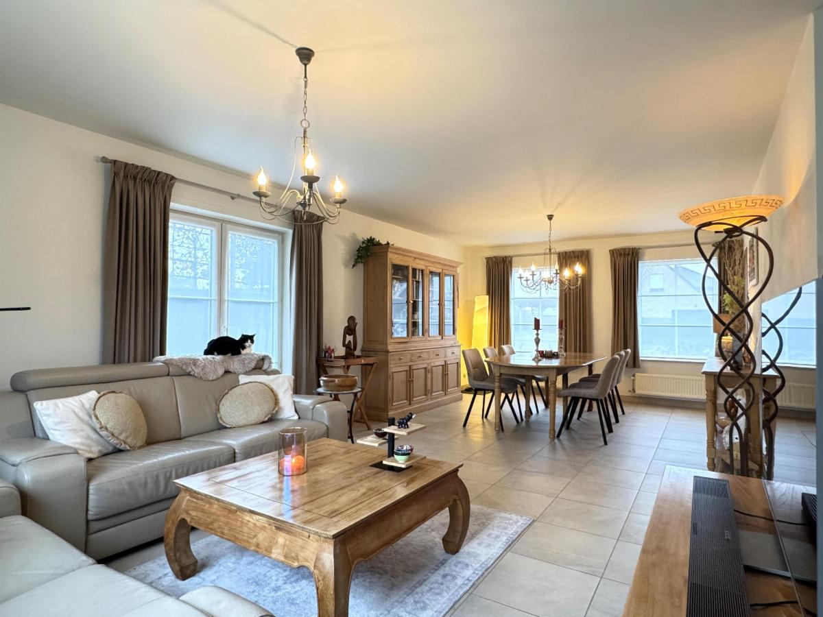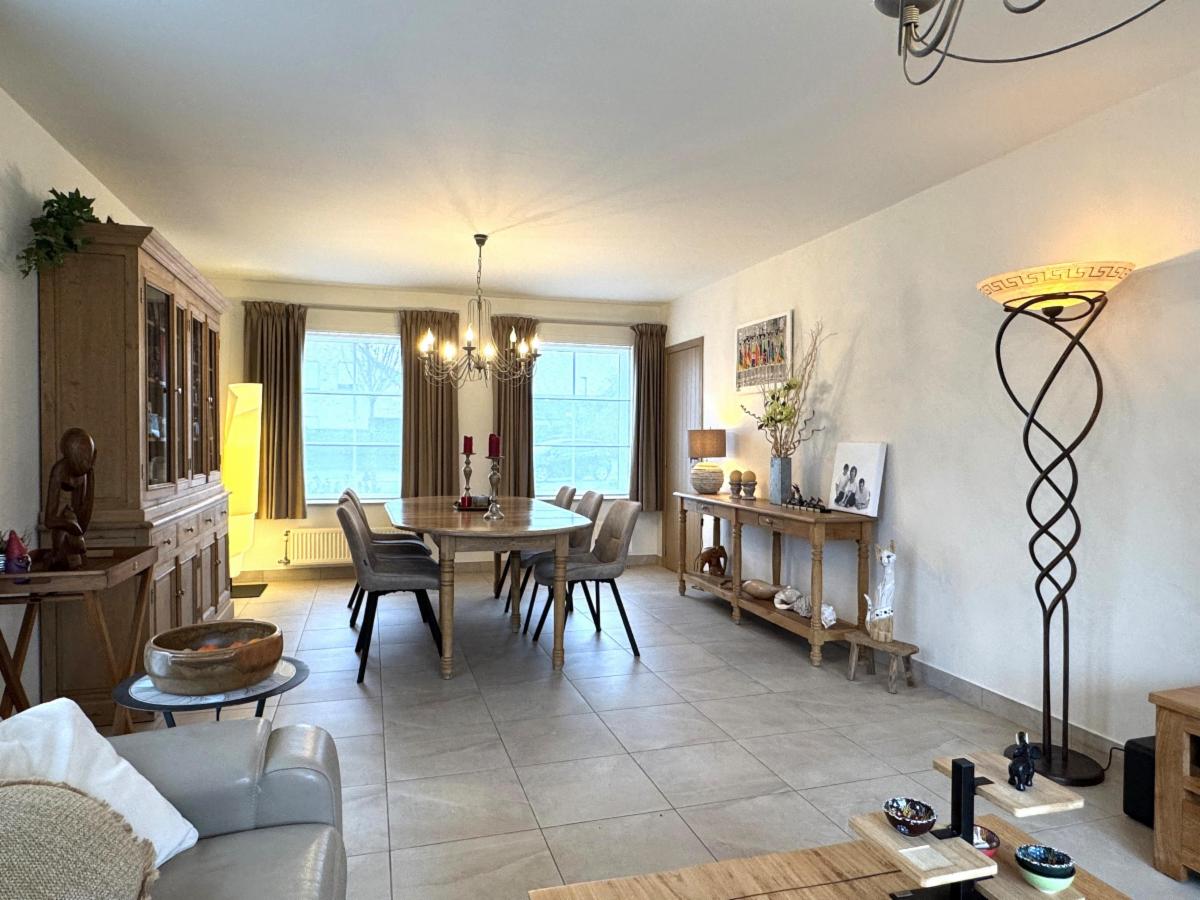 Lichtrijke en gezellige living met eet-en zithoek, geïnstalleerde keuken (warme lucht-oven, micro-golf, vaatwas, koelkast - Zanussi) met eethoek, berging en wasplaats.