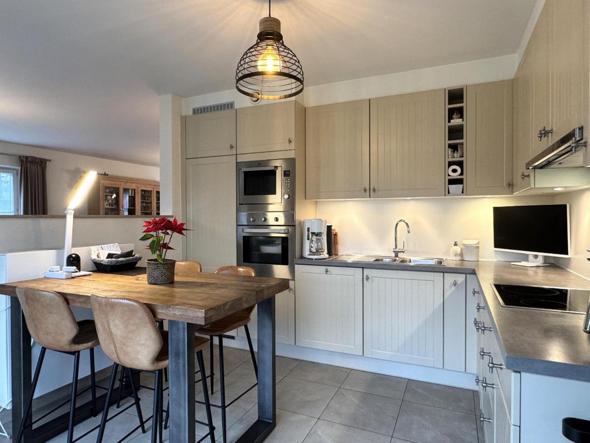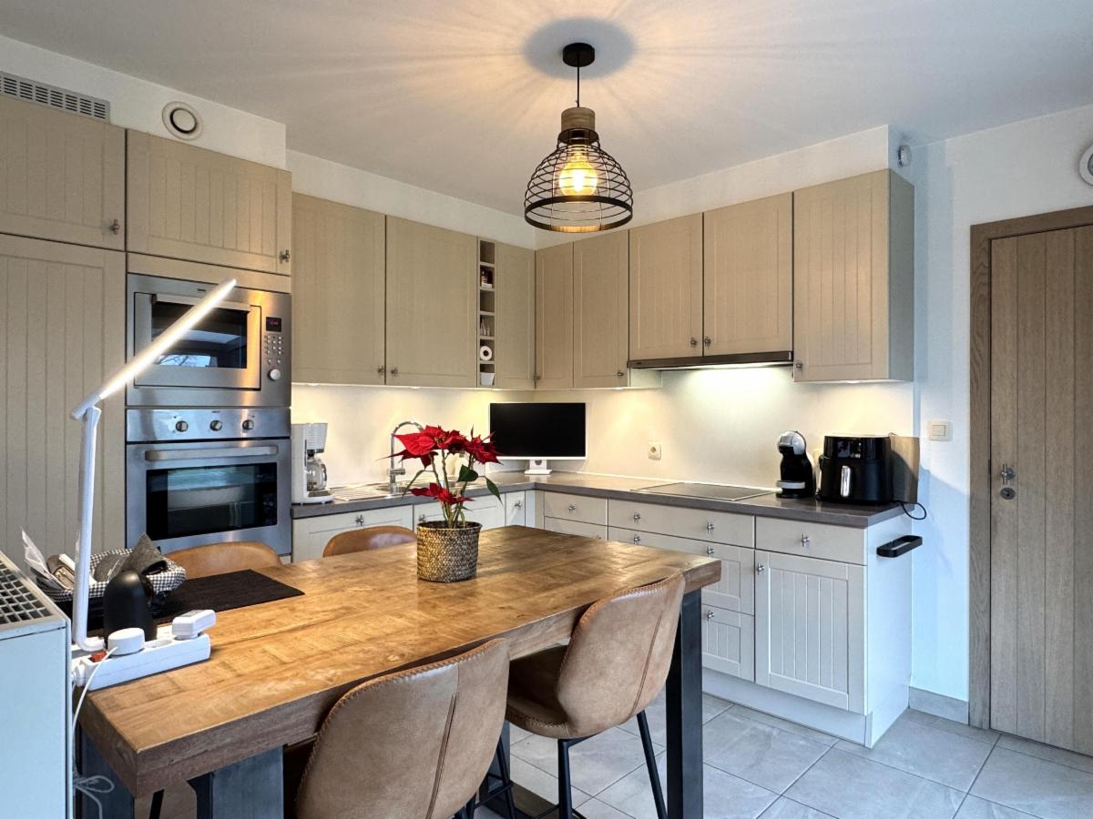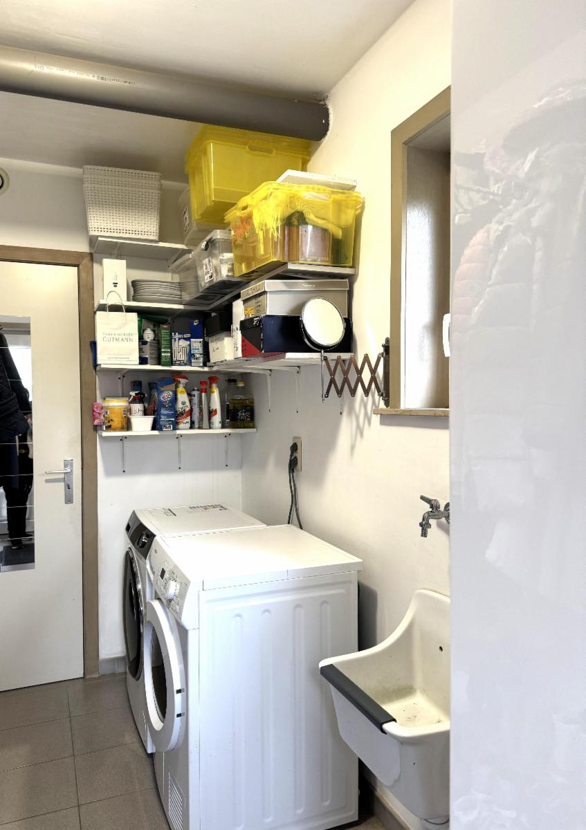 Lichtrijke en gezellige living met eet-en zithoek, geïnstalleerde keuken (warme lucht-oven, micro-golf, vaatwas, koelkast - Zanussi) met eethoek, berging en wasplaats.
