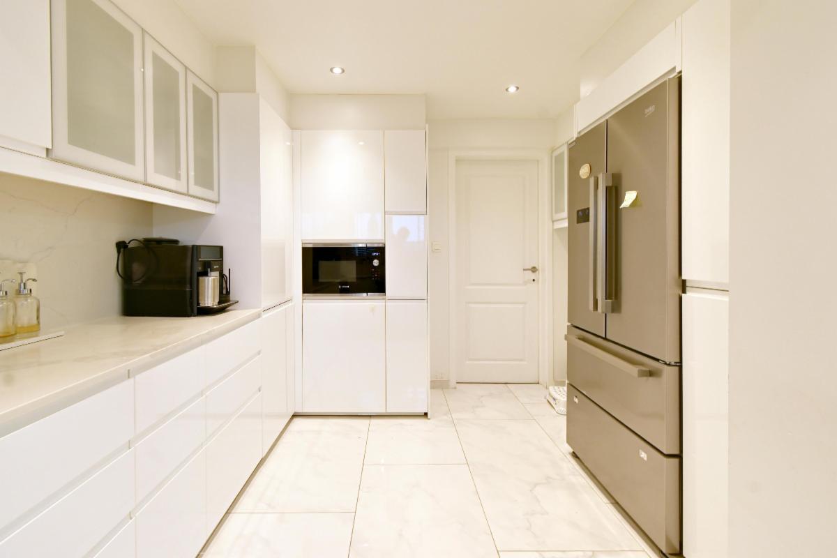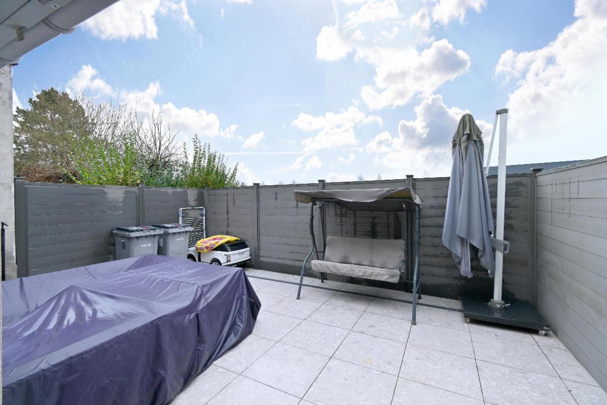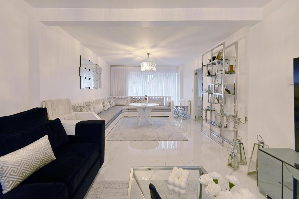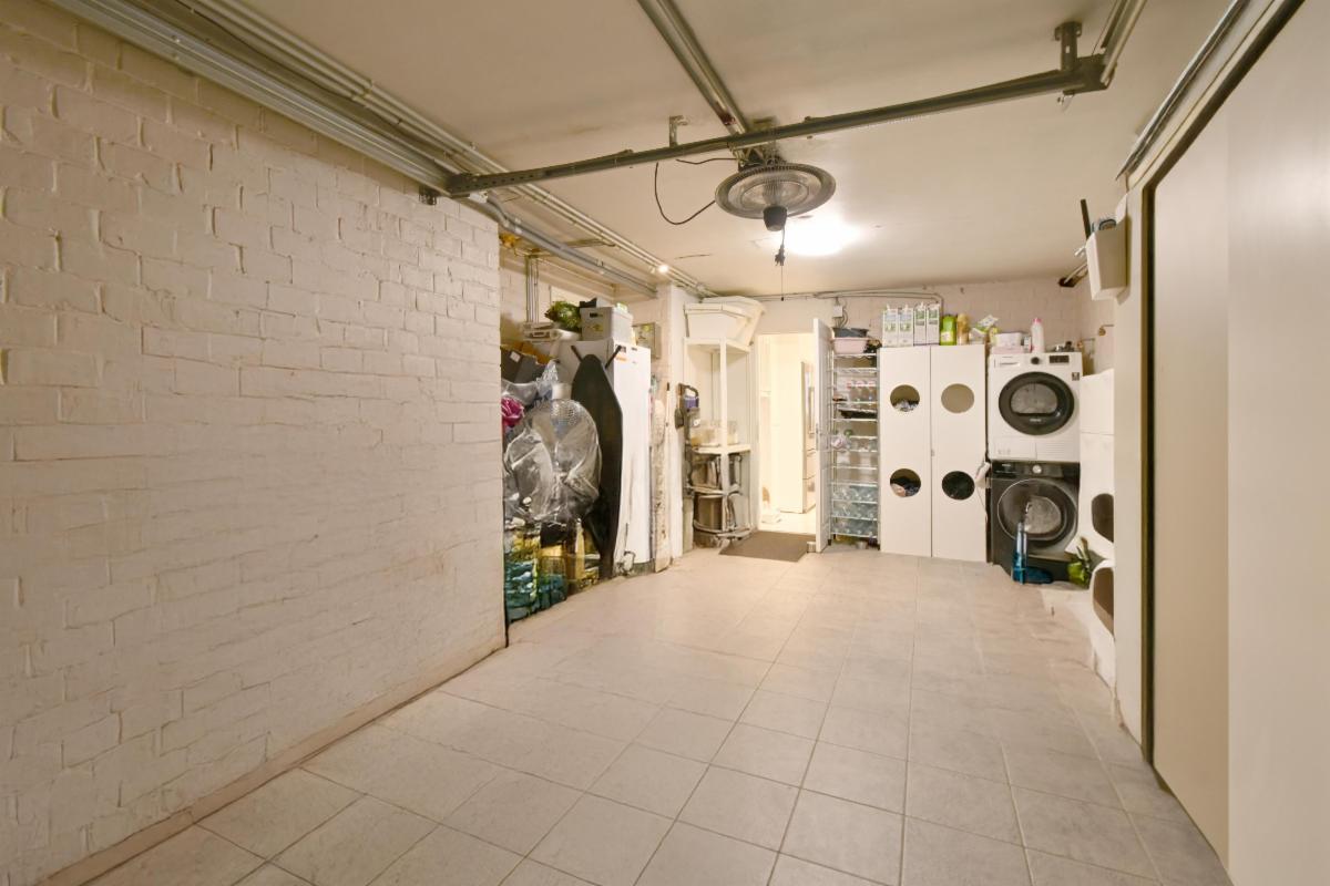 Gelijkvloers: ruime inkomhal, garage, keuken, zithoek en eetkamer, koer/hof