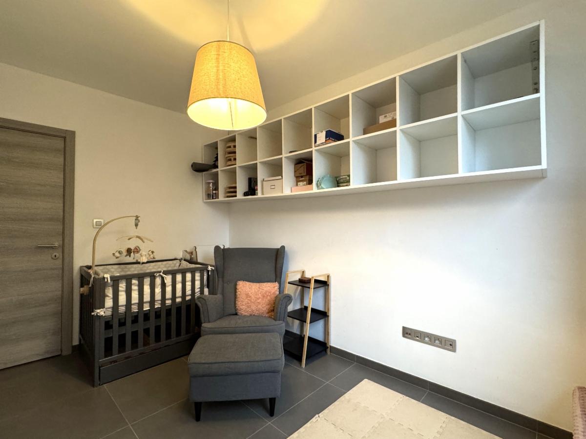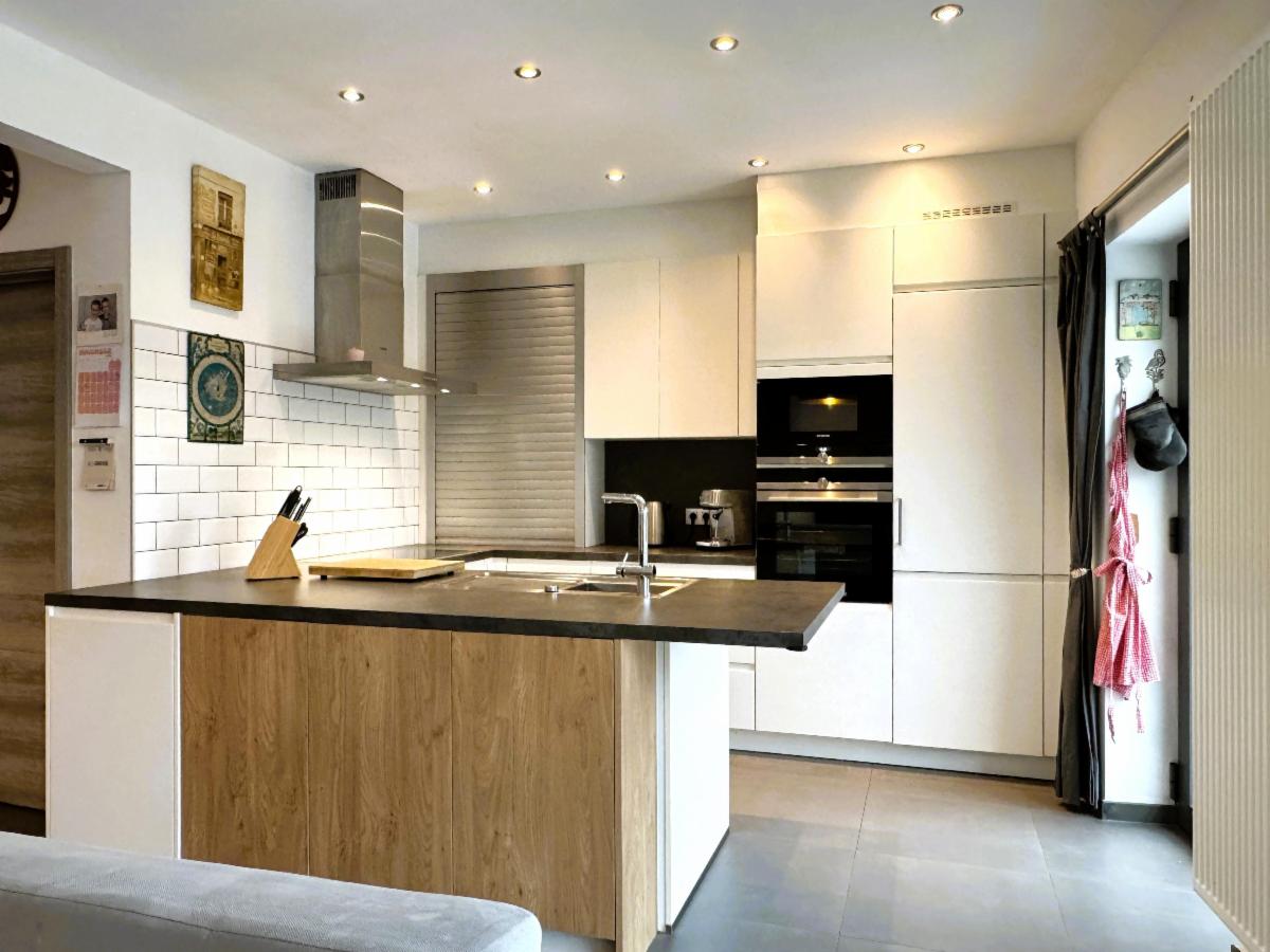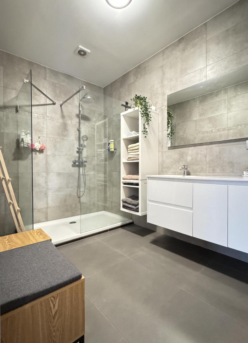 Ruime en lichtrijke living met eet-en zithoek, geïnstalleerde keuken met eiland (koelkast, inductie-kookplaat, oven, microgolf en vaatwas), logeerkamer en ingerichte badkamer (inloopdouche en lavabo).