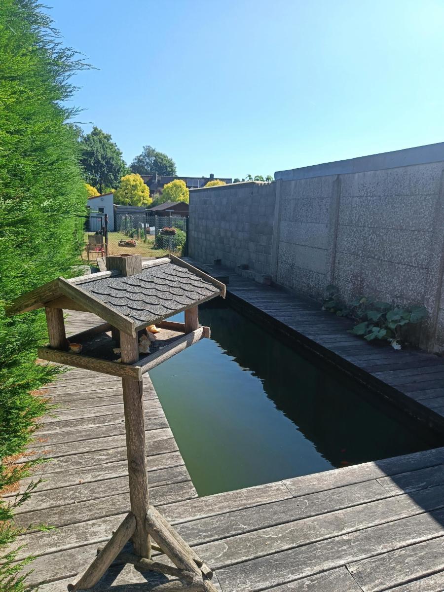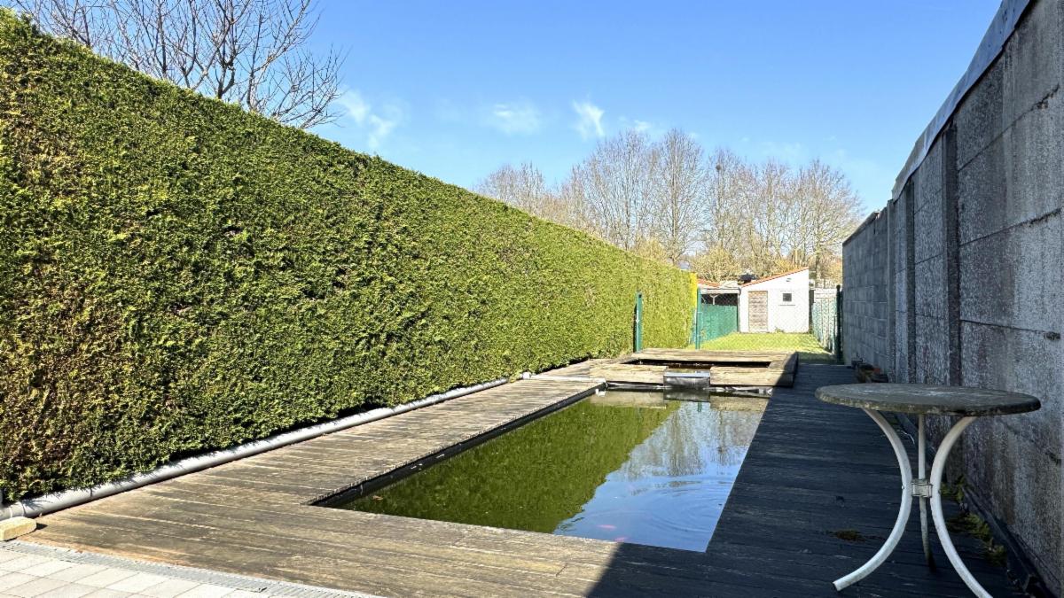 Rustgevende terras met vijver en tuin.