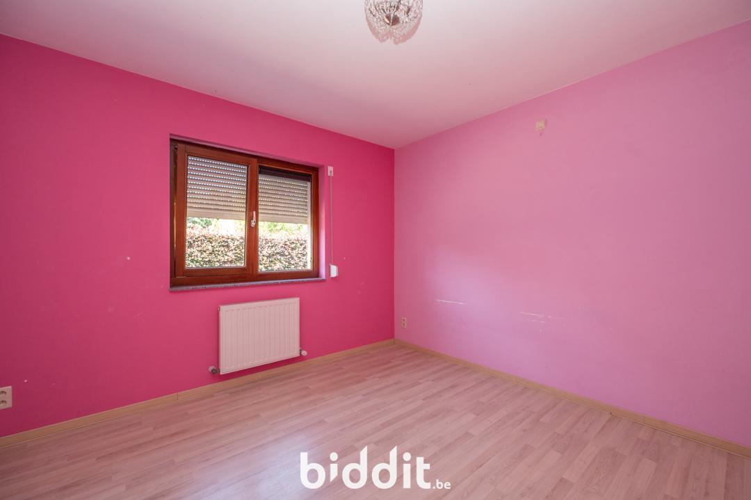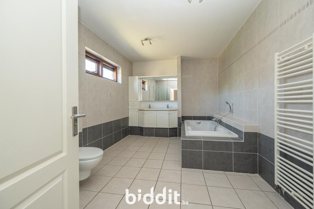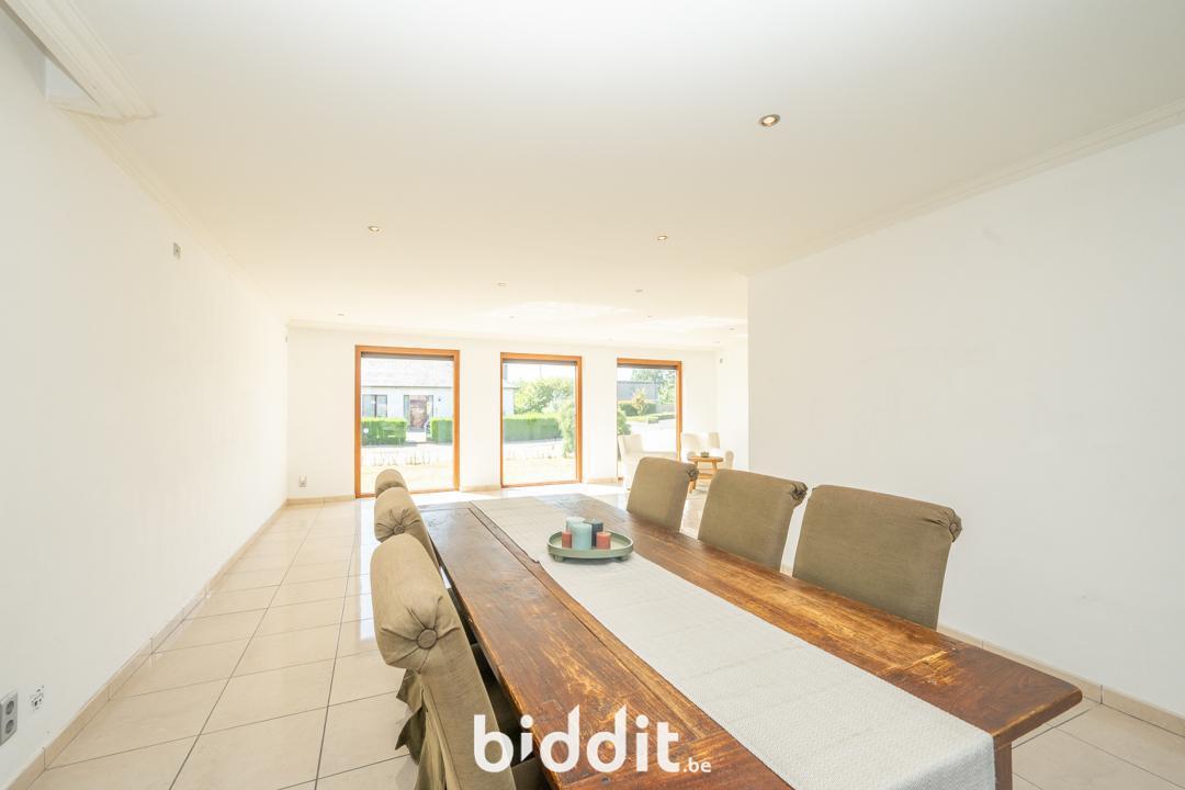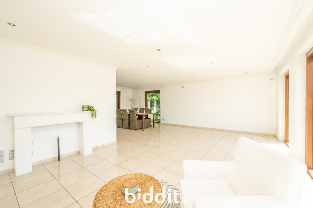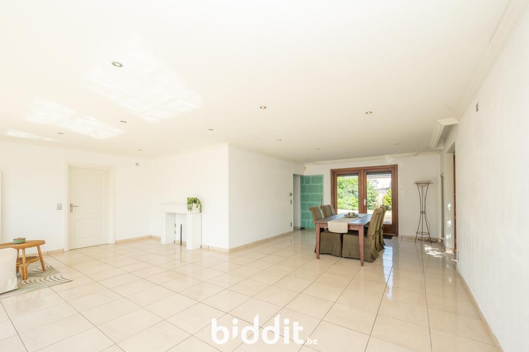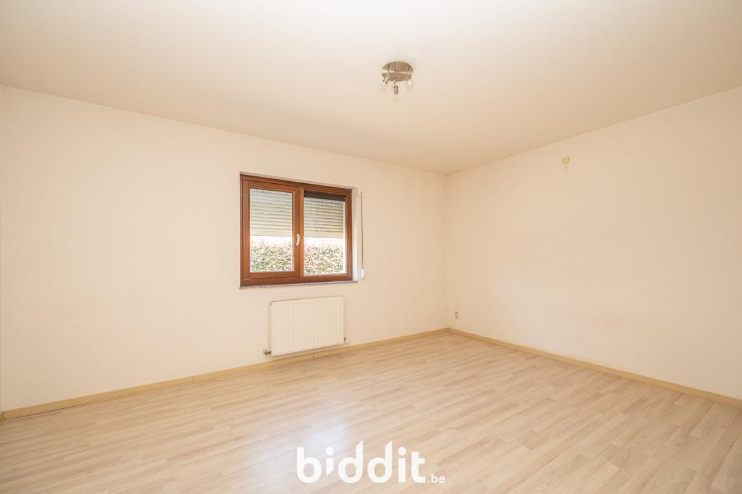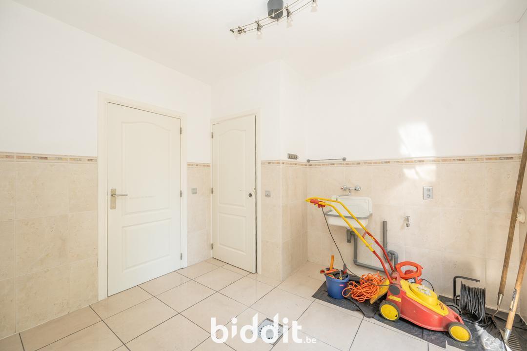 Op de gelijkvloerse verdieping bevindt zich: een ruime inkomhal, toilet, grote leefruimte die uitkomt op de keuken, bergruimte met directe toegang tot de tuin, badkamer en vier slaapkamers.