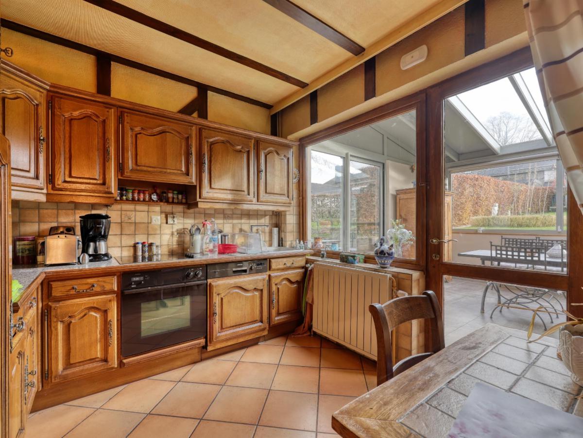- Au rez-de-chaussée : un hall d'entrée en "L" (1.85x1.4 et 2.9x2.16) avec vestiaire et WC (WC suspendu avec lavabo - 1.7x1.2), un séjour carrelé avec cassette à bois et balcon à rue (8x4), une cuisine équipée carrelée et en chêne (3.1x2.8), avec accès à une grande véranda (7.55x4) ;