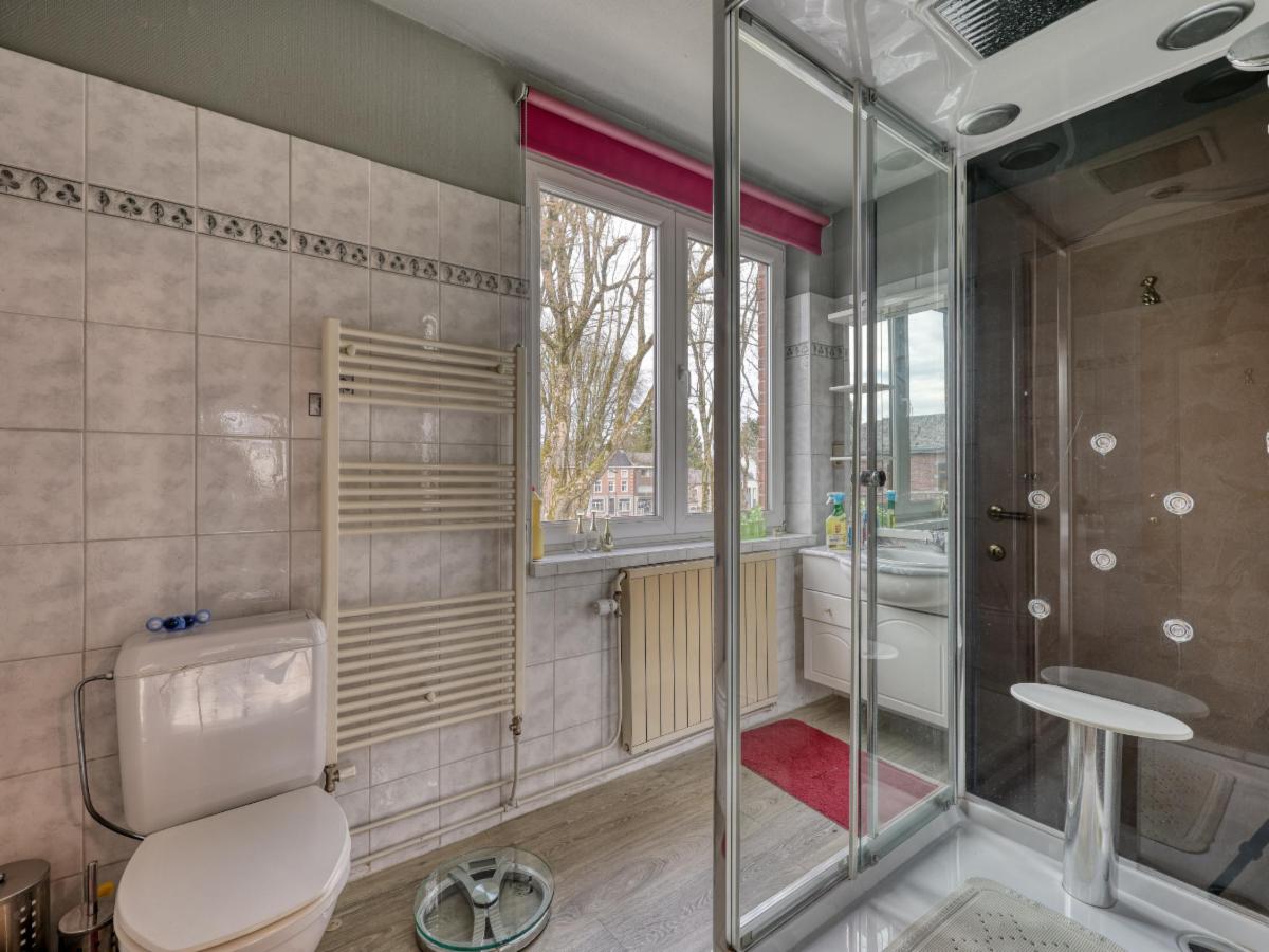 - Au 1er étage : un hall de nuit sur parquet flottant (3x2.2), une salle de douche sur parquet flottant ((3x1.85) WC, cabine de douche et lavabo), trois chambres (deux grandes (4x3.9 & 4x3.88) et une plus petite (3.14x2.77)).