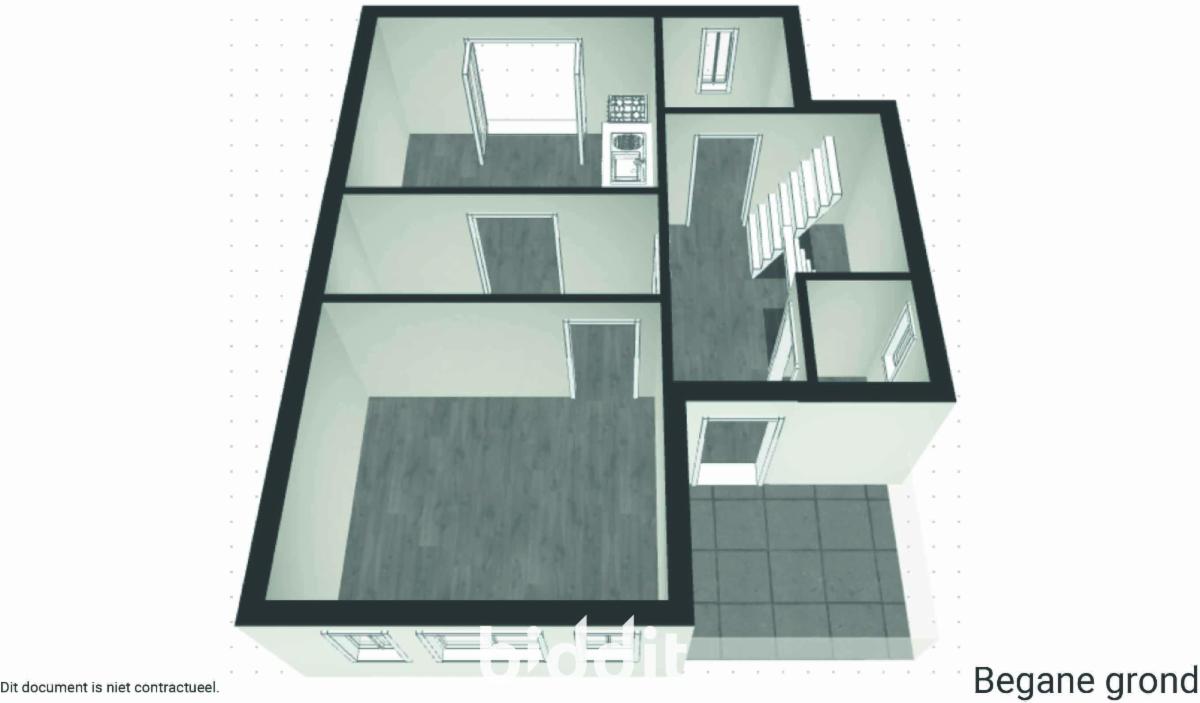 Op het gelijkvloers is een leefruimte, keuken, wc en bergruimte.