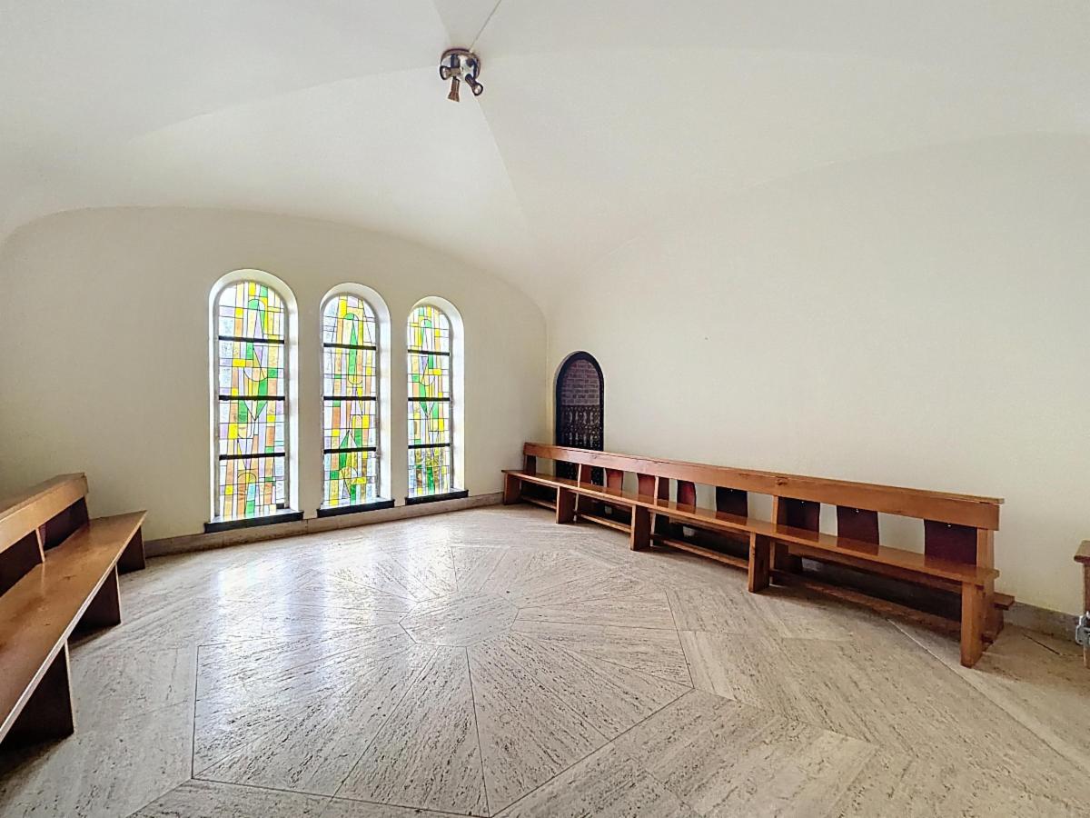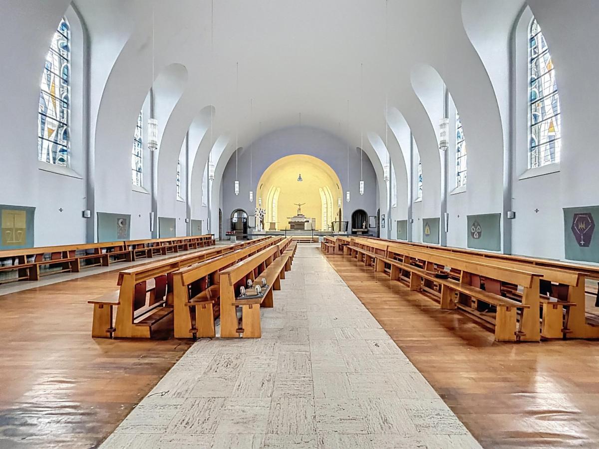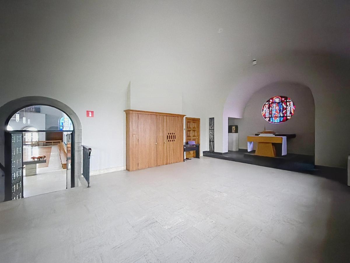 Kerkgebouw bestaande uit: Kelder: polyvalente zaal met toog, 2 bergingen, keuken, sanitair blok, technisch lokaal en niet ingerichte kelderruimte; Gelijkvloers: inkomportaal, kapel, toren met klok, doopkapel, berging, koor, sacristie, lokaal koor, 2 ornamentenlokalen, winterkapel; 1e Verdiep: traphal, repetitielokaal, balkon met orgel, toren met trap.
