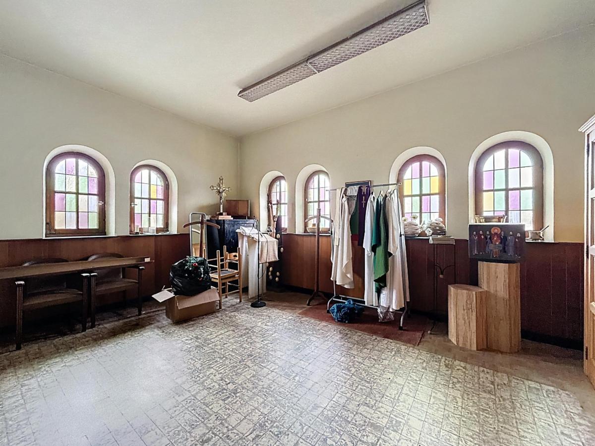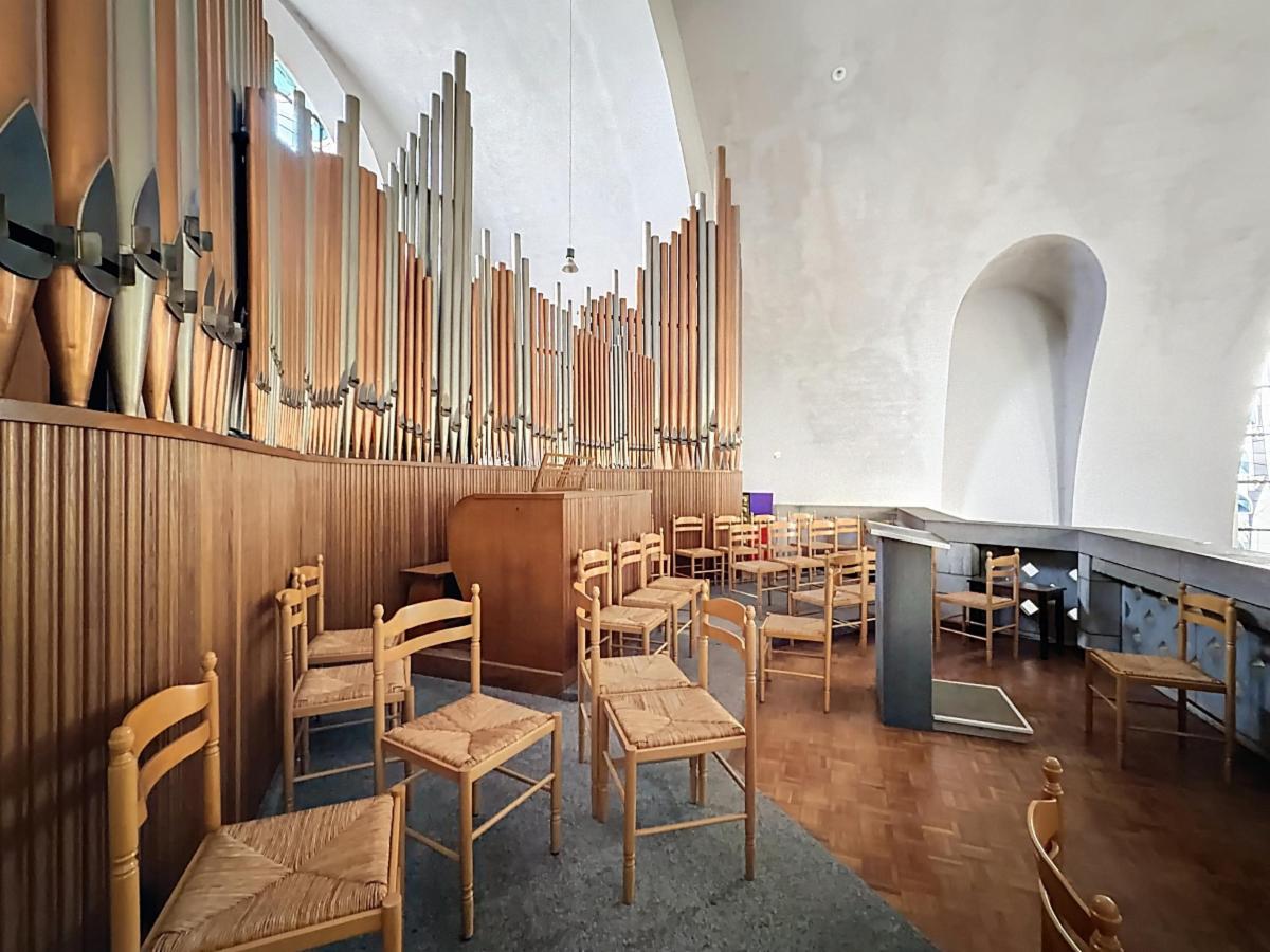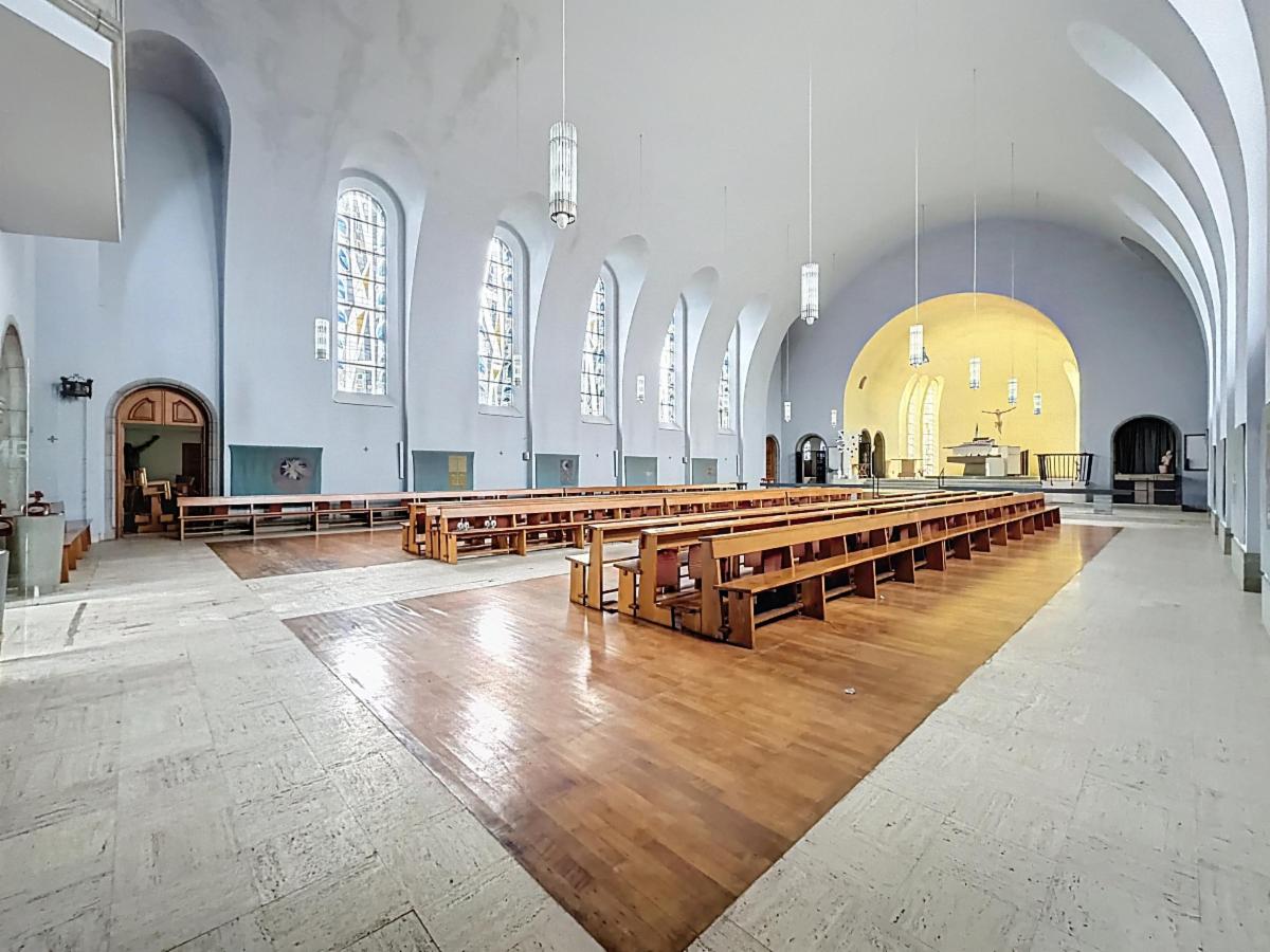 Kerkgebouw bestaande uit: Kelder: polyvalente zaal met toog, 2 bergingen, keuken, sanitair blok, technisch lokaal en niet ingerichte kelderruimte; Gelijkvloers: inkomportaal, kapel, toren met klok, doopkapel, berging, koor, sacristie, lokaal koor, 2 ornamentenlokalen, winterkapel; 1e Verdiep: traphal, repetitielokaal, balkon met orgel, toren met trap.
