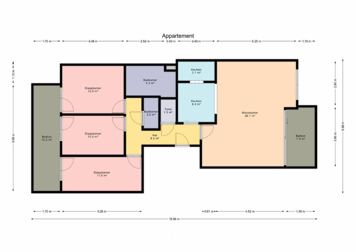 Keuken, living, 3 slaapkamers, badkamer, douchekamer, terras voor- en achteraan, inclusief kelder.