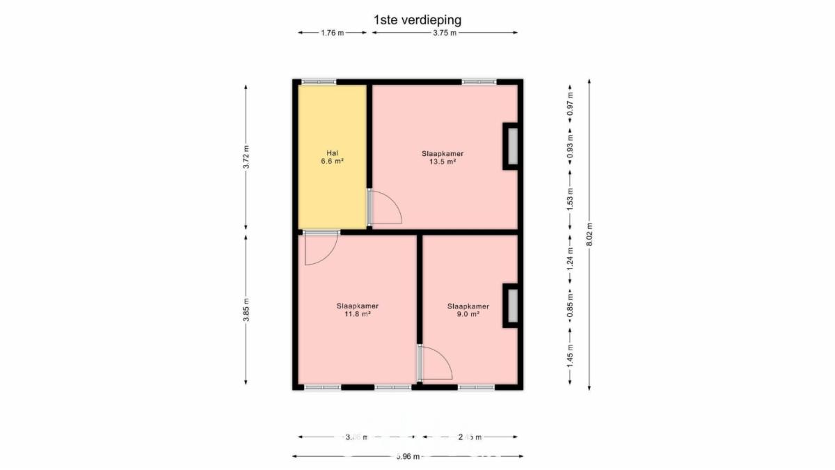 1e verdieping: hal, 2 normale slaapkamers en 1 kleine slaapkamer;
