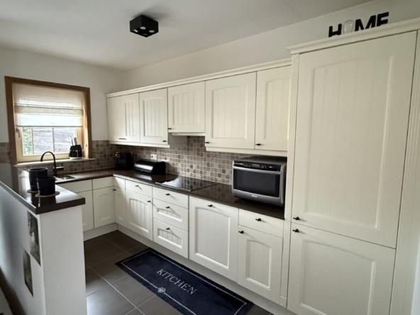 -Rez-de-chaussée : hall d’entrée avec escalier apparent, WC séparé, séjour avec salon (vue jardin – baie vitrée coulissante), salle à manger, cuisine équipée ouverte avec bar (plaque de cuisson vitrocéramique, hotte télescopique, lave-vaisselle, double évier en inox, frigo/congélateur encastré, plan de travail en composite).