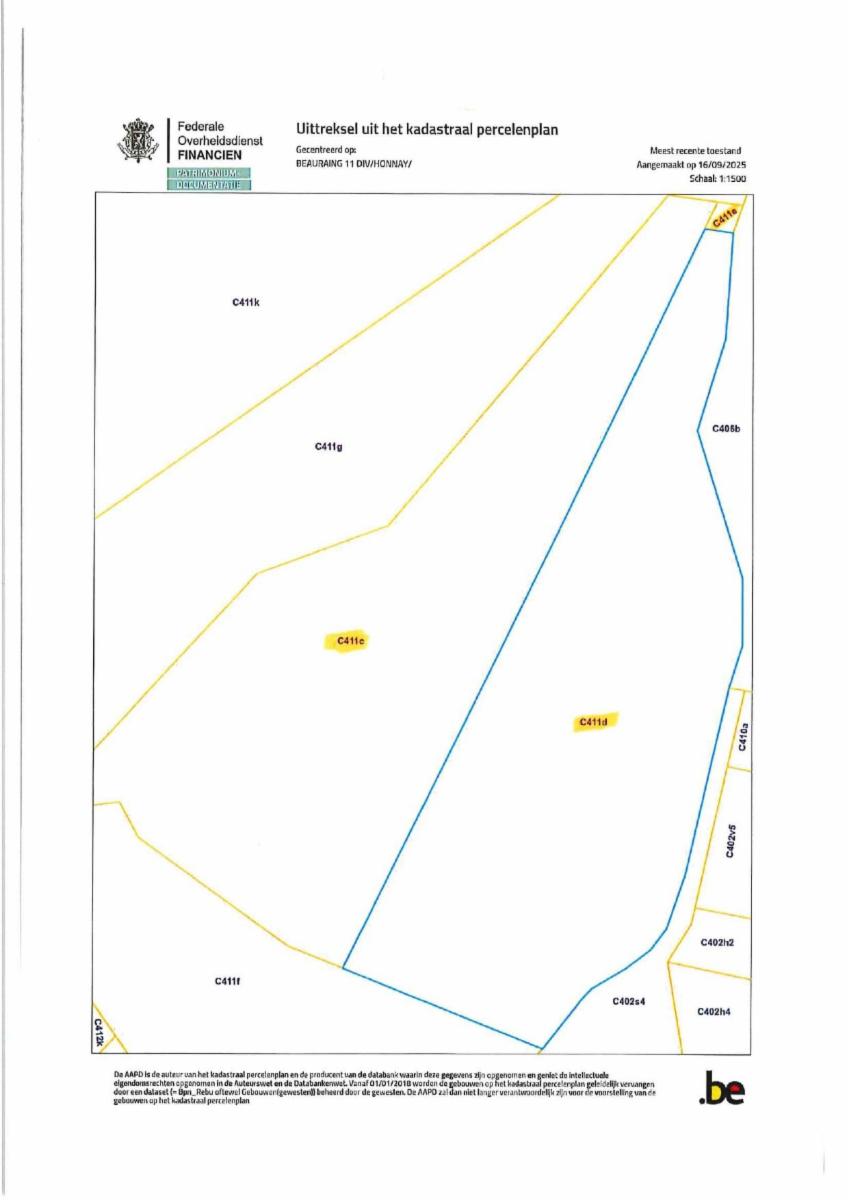 Pâtures sises à Honnay (Beauraing), au lieu-di Aisance d'Esclage, cadastrées section C numéros 0411DP0000, 0411CP0000 & 0411EP0000 pour une contenance totale de 4 hectares 92 ares 70 centiares. Zone agricole et zone forestière au plan de secteur. Occupées suivant bail à ferme verbal. Prix demandé : 15.000,00 €/ha sauf offre supérieure et sous réserve accord du juge compétent.